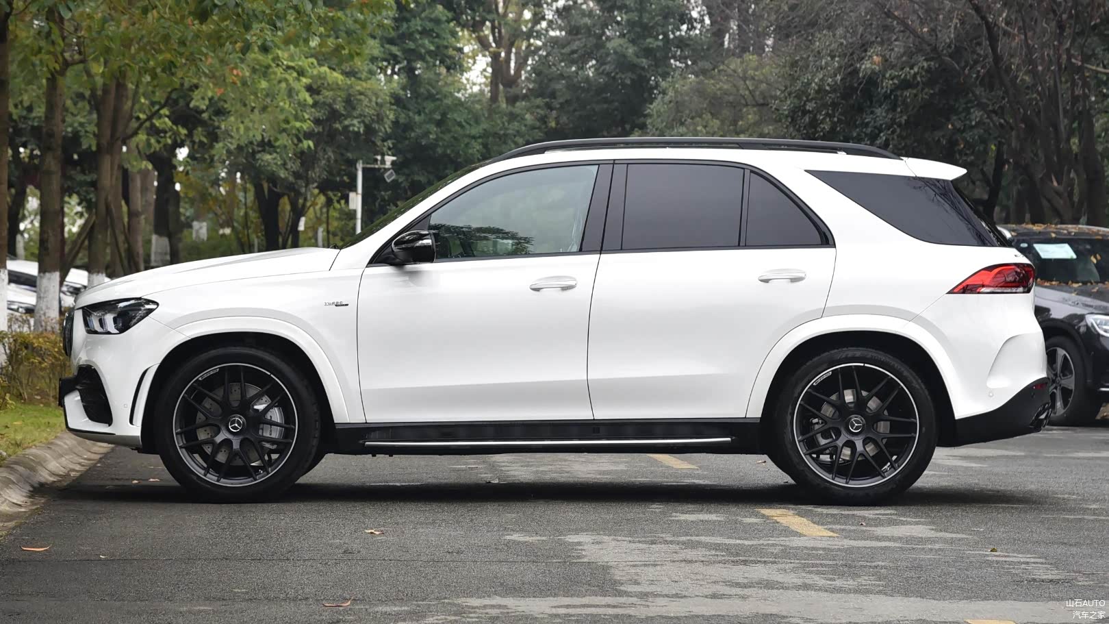 车身侧面的造型很优雅,完全看不出这是一台性能猛兽。车身腰线从车头贯穿至车尾,在视觉上拉伸了整车的长度。黑色的行李架搭配黑色的侧包围,让奔驰AMG GLE的车身侧面看起来更有层次感。宽大的C柱是奔驰GLE车型的标志性设计,更容易与同级车型进行区分,提升整车的辨识度。车身尺寸方面的长宽高分别为:4947/2015/1782mm,轴距为2995mm,与之匹配的是21英寸AMG轮毂。