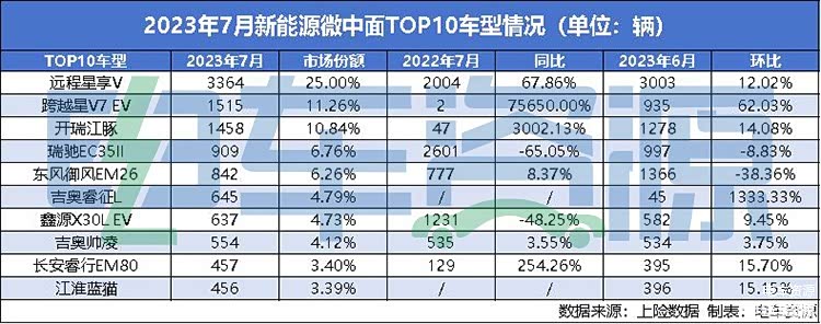 从具体细分车型来看, 远程星享V(图片 | 参数 | 询价)系列以25.00%的市场份额继续蝉联新能源微中面销量榜销冠,7月单月销量3364辆,同比增长67.86%。其中,远程星享V5E销量198辆,远程星享V6E销量3166辆。
