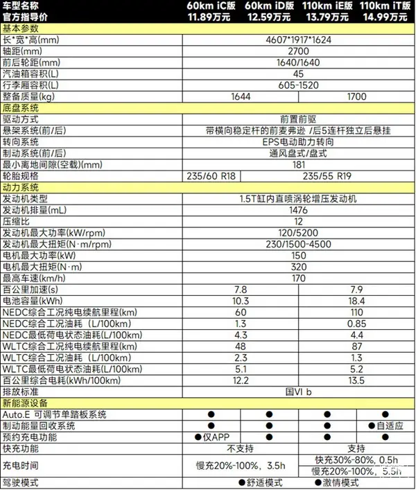 指导价格11.89万元,配备了自修复车漆技术、极光之翼贯穿式前灯、多维晶体LED远/近灯、LED日间行车灯、自动大灯、简约分体式尾灯、低风阻镂空尾翼、22英寸一体式联屏、多功能运动方向盘、方向盘4向调节、数字拨挡、一体式运动座椅、前排隐藏式出风口;TPMS 胎压显示;Say hi 音效、手机APP远程控制、手机APP虚拟销匙、启动车辆、Carlife、车载蓝牙;高刚性ZONE BODY车身结构、发动机电子防盗锁、前排双气囊、前排侧气囊、前排预紧限力式安全带+自锁式锁舌、后排两侧三点式限力/中间三点式安全带、前排安全带未系提醒、ISO FIX儿童座椅接口+儿童锁、ESS 紧急制动系统、DPB 驻车动态制动、ABS 防抱死制动、EBD 制动力分配、TCS 牵引力控制、HSA上坡辅助、HBA 液压制动辅助、EPKB 电子驻车制动系统、Auto Hold 自动驻车、ESP 车身稳定控制、VSP行人靠近车辆声响警示系统,座椅材质 、后排座椅4/6分割放倒、前排中央扶手、智能感应钥匙(1.2m内自动解锁).智能手机虚拟钥匙、NFS无感智能启动、钥匙遥控门锁、车窗一键升降(带防夹功能)(驾驶位)、外后视镜电动调节.内后视镜手动防眩目功能、前排空调系统、USB接口数量 、扬声器数量、前排12V电源、前排车内化妆镜、前排地图灯+后排阅读灯、补胎液,搭载18英寸轮圈和235/60 R18的轮胎规格;搭载10.3kWh容量电池组;不支持快充。
