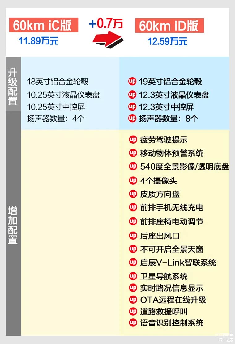 指导价格12.58万元,相比最低配,价格提升了7000块钱,但增加疲劳驾驶提醒,道路呼叫救援,360度全景影像,透明底盘,定速巡航,卫星导航,百度地图,远程启动,全景天窗,语音识别控制,4G网络,OTA升级,车载KTV,手机无线充电,主副驾驶座椅电动调节,后座出风口等功能。同时车内双联屏尺寸由10.25英寸提升至12.3英寸,配置得到一定程度提升。其智能化表现得到了较大幅度的提升。