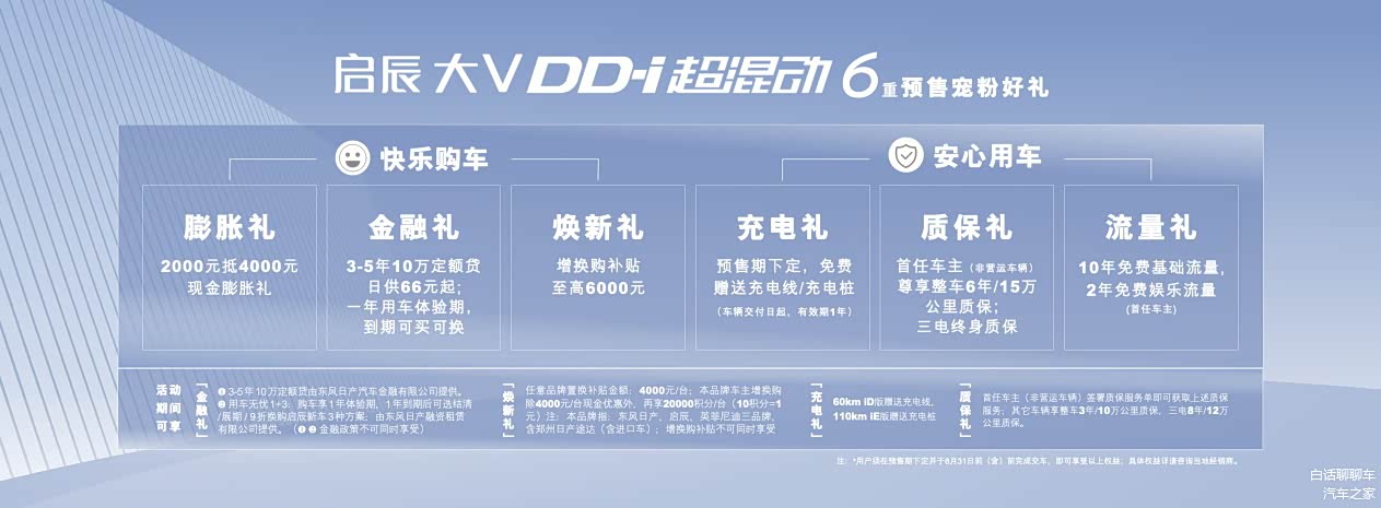 东风日产启辰大V DD-i超混动为了给用户带来贴心的购车体验,推出了宠粉6重好礼,涵盖了膨胀礼(这是指对于购买启辰大V DD-i超混动的消费者,可以享受到一定的购车优惠或额外的购车礼包)、金融礼(提供定额贷款,10万元以内的贷款只需每日66元起,让购车更加灵活和便捷)、焕新礼(提供增换购补贴,最高可达6000元,帮助车主更新车辆,焕发新的驾驶体验。)、充电礼(赠送充电线或充电桩,方便车主在家中或其他合适的场所进行车辆充电)、质保礼(首任车主(非营运)可享受6年或15万公里的整车质保,同时还有三电终身质保,确保车辆质量和可靠性,其中还包括用车无忧1+3,提供1年的用车体验期,让用户在购车后可以更好地了解和熟悉车辆,同时可以享受到3年的可买可换政策,为购车者提供更灵活的选择)和流量礼(根据用户需求,启辰大V DD-i超混动提供了一定额度的流量赠送,让用户可以随时享受车载互联功能,畅享网络服务),提供了从快乐购车到安心用车的无忧礼遇政策。这些宠粉6重好礼的推出,旨在为用户营造一个愉快的购车体验,并提供全方位的支持和服务,让用户在使用启辰大V DD-i超混动时感受到无忧和便利。