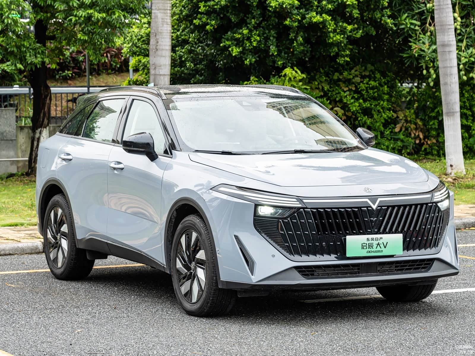 启辰大V DD-i超混动的前脸设计展现了现代感和科技感,给人一种时尚而动感的视觉效果。前脸采用了时下流行的家族式设计,细节处理精致,彰显出品牌的独特风格。在外观设计上延续了燃油版车型的V-galaxy设计风格,这个设计风格给车辆带来了独特的时尚感和动感。前脸部分采用了V型熏黑进气格栅,这一设计元素为车辆增添了一丝运动感和力量感。熏黑的处理使得进气格栅看起来更加沉稳和深邃。V型格栅的造型也呼应了车辆整体的设计语言,创造出一种时尚而大气的外观效果。这种前脸设计不仅凸显了车辆的个性和品牌风格,还在视觉上增强了车辆的宽度感和稳定感。V型熏黑进气格栅与车身线条相互呼应,形成了一种流畅而协调的外观氛围,整体呈现出一种时尚、凌厉的形象。
