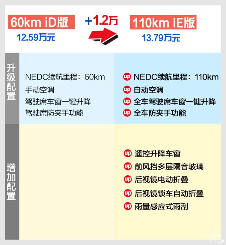 指导价格13.79万元,价格相比次低配,提升了1.2万,但匹配大容量电池组,纯电续航里程由60km提升至110km,如果是充电比较方便,同时还想控制日常用车成本,这款车比较合适,另外配置层度,提供了车窗一键升降、车窗防夹手、自动空调、前排多层隔音玻璃、后视镜折叠、自动感应式雨刷等等功能,便利性表现出色。如果对于辅助驾驶不太急需,这款车是最值得推荐的。