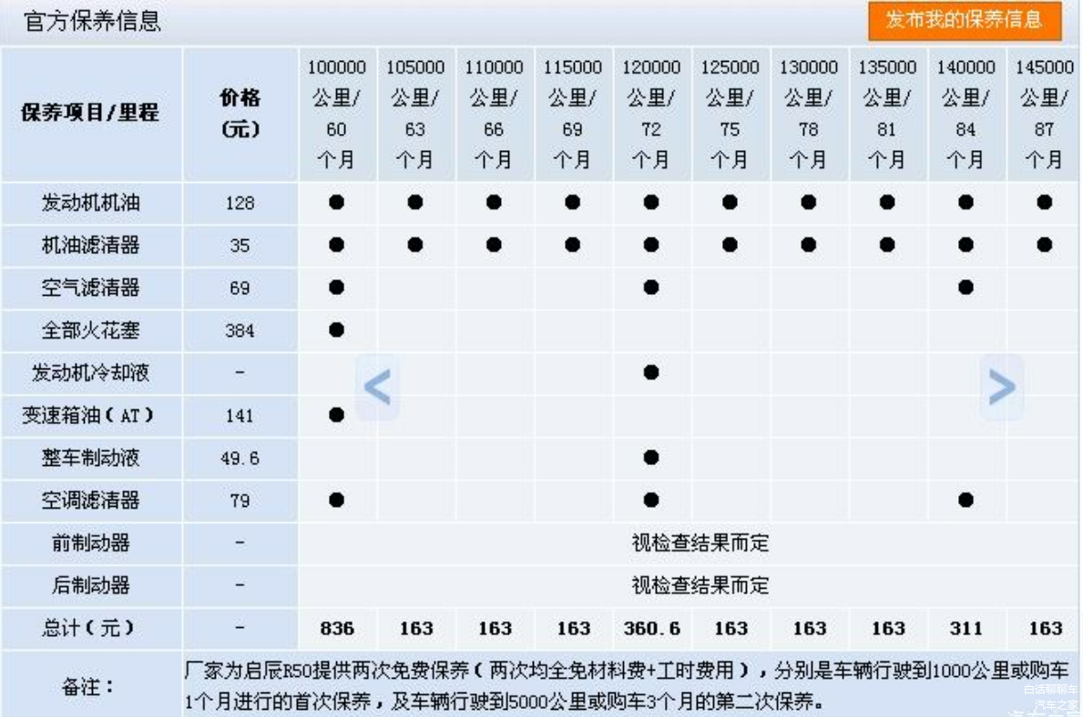 保养部分:启辰大V DD-i保养周期为5000公里,免费首保在5000公里时进行。首保过后,每5000公里需要更换机油机滤;每20000公里内需要做一次常规保养。按照普通家庭三年六万公里行驶标准,启辰大V DD-i所需的保养费用大概在6000元左右,平均每年所需的保养费用约2000元左右。