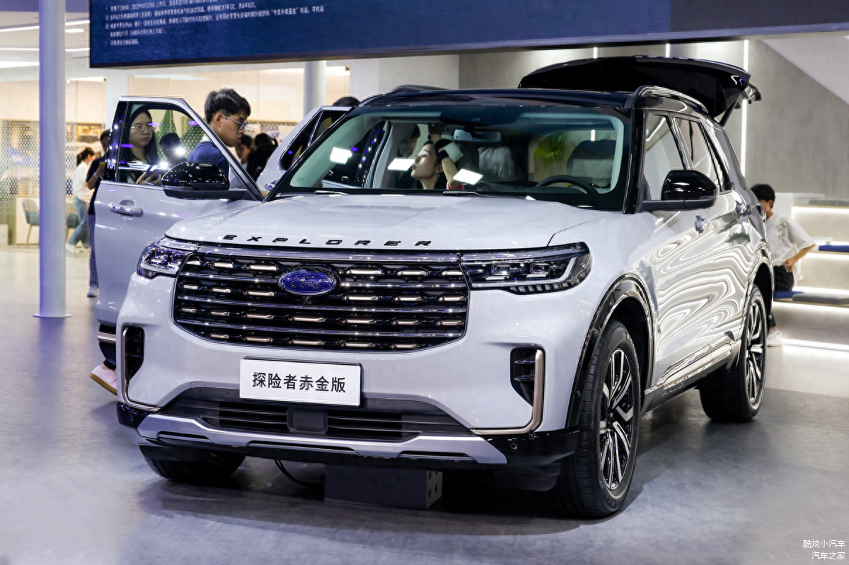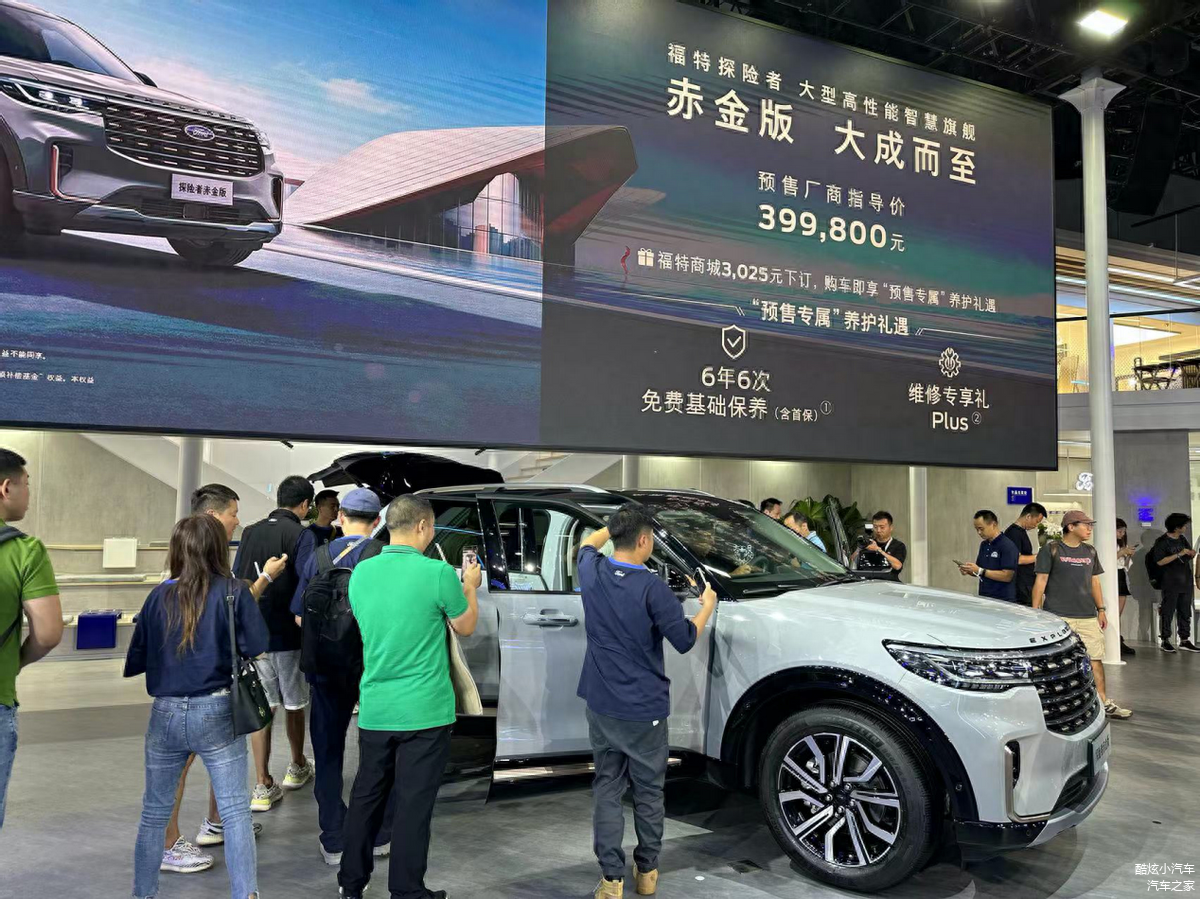跟兄弟来成都车展,原本是他要交锐界L的订金。转了转,我注意到了展台中央的探险者赤金版。预售价跟昆仑巅峰版一样,豪华气息更强了。这车和昆仑巅峰版有些不同。昆仑巅峰版那种野性的外观,给人一种征服的感觉。而赤金版,它给人的第一感觉就是尊贵,特别是那前脸格栅的金色条纹,灯光下闪闪发亮,气质立马就出来了。我以前在豪车馆看到过宾利添越,这探险者赤金版,也有那种气场。