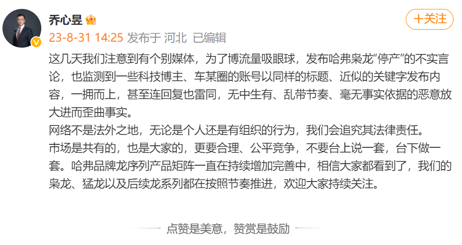哈弗汽车近期推出的全新插电混动SUV枭龙系列又遭遇攻击,就长城汽车高管乔心昱所讲,又个别媒体发布“哈弗枭龙停产”的不实言论,其中使用的关键字相同,几乎是一拥而上,进行无中生有的传播。