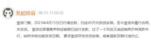 有消费者8月21日表示:“2023年4月15日已付清全款,约定45天内到货安装。至今皇派未履行合同,未发货。皇派总部督察声称经销商已经付全款,过了一个月后又说经销商还有尾款未付,始终未给出能发货日期。要求皇派尽快发货安装,或者退款及赔付违约金。”该条投诉至今仍未解决。