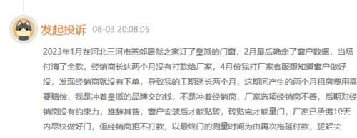 根据黑猫投诉平台显示,有消费者8月3日投诉称:“2023年1月在河北三河市燕郊居然之家订了皇派的门窗,2月最后确定了窗户数据,当场付清了全款,经销商长达两个月没有打款给厂家,4月份我打厂家客服想知道窗户做好没,发现经销商就没有下单,导致我的工期延长两个月,这期间产生的两个月租房费用需要赔偿,我是冲着皇派的品牌交的钱,不是冲着经销商,厂家选经销商不善,后期对经销商没有约束力,难辞其咎,窗户安装后才能贴砖,砖贴完才能量门,厂家已承诺10天内尽快做好门,但经销商拒不打款,以最终门的测量时间为由再次拖延付款,望解决。”