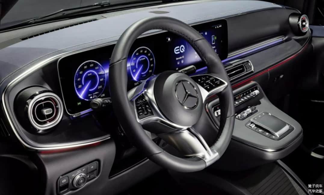 内饰方面,新款V-Class的外观只是一个开胃菜。根据配置的不同,内饰将采用多种颜色搭配,如图中的碳素黑配银色拉丝和红色氛围灯等,充分展现了奔驰的优势。就连最简单的方向盘也充满艺术感。显示区是一块串联式的多媒体屏,中央悬浮式控制面板配备触控板。