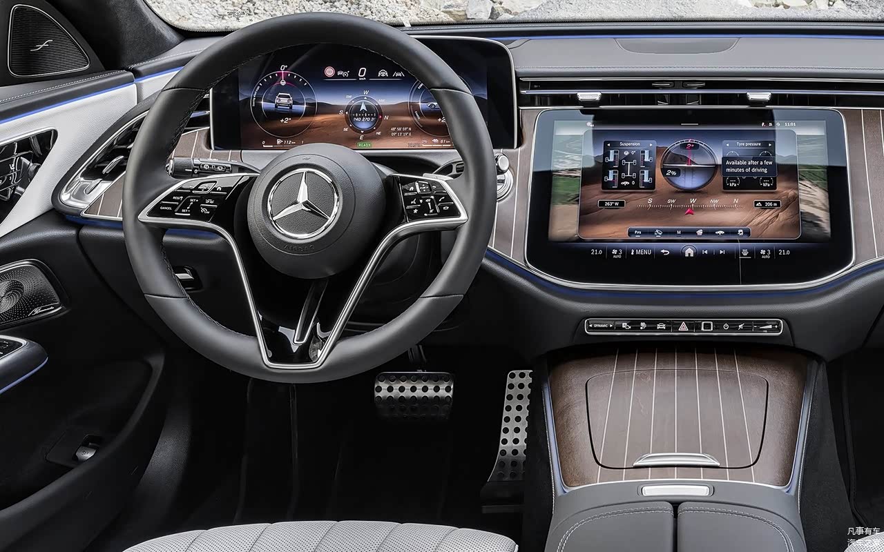 车辆内部的设计明显与奔驰E级轿车同步,整体规划和布局几乎没有什么区别,特别是E级轿车应有的豪华性保持非常到位。当然车辆内部功能也根据车型功能的不同进行了调整,在E级All-Terrain的越野模式下,新的E级全地形的驾驶员显示器和中央显示器切换到越野屏幕,与360°摄像头配合使用的“透明引擎盖”功能,可让中央显示屏显示出车辆前部下方的虚拟视图,帮助驾驶员易于阅读相关信息和了解车辆周围情况,并可直接通过功能键进行切换控制。