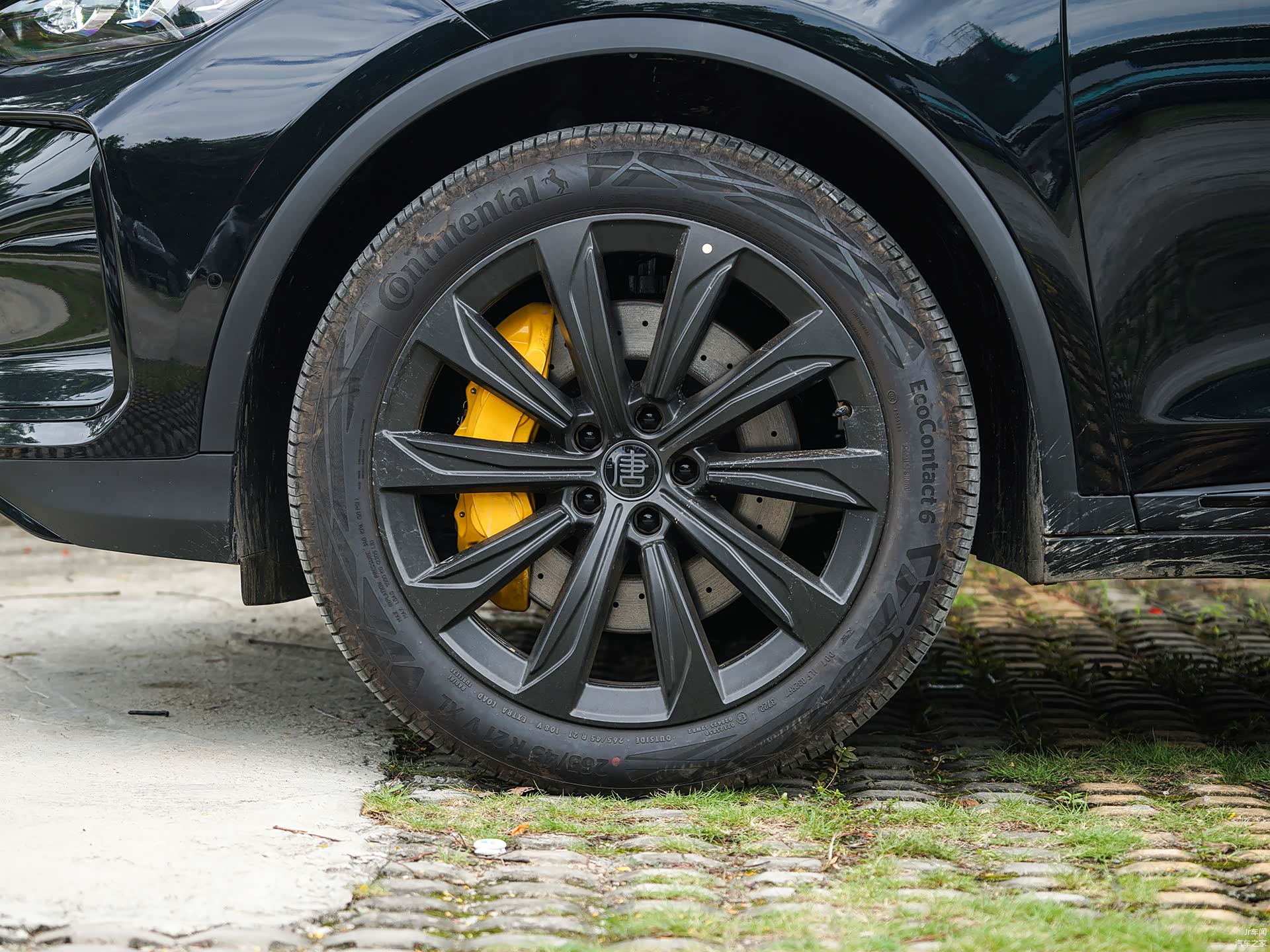 除此以外,它的前轮刹车系统升级为六活塞卡钳 大尺寸打孔通风刹车盘的组合,金黄色的六活塞卡钳不仅极为抢眼,而且还为其刹车性能提供了更有效的保障。另外,它的轮胎规格也从冠军版的255/50 R20升级到265/45 R21,采用的是马牌EcoContact 6低滚阻轮胎,虽然该轮胎并非以性能为主打,但抓地力确实可圈可点。
