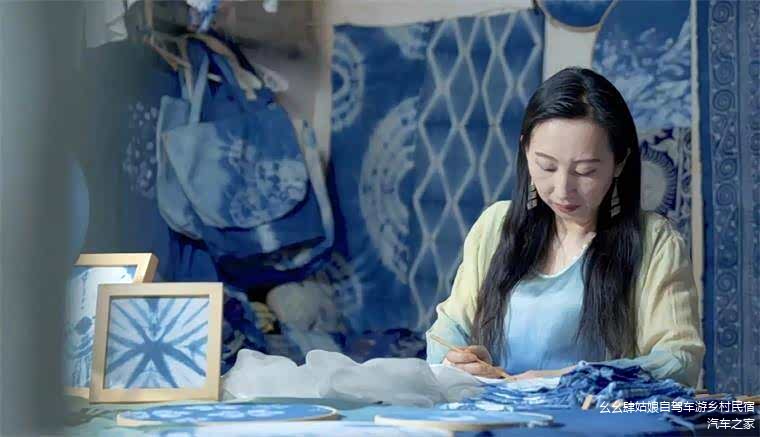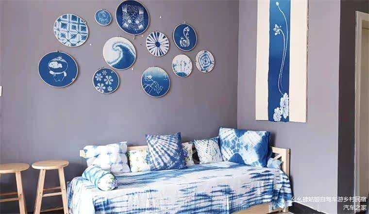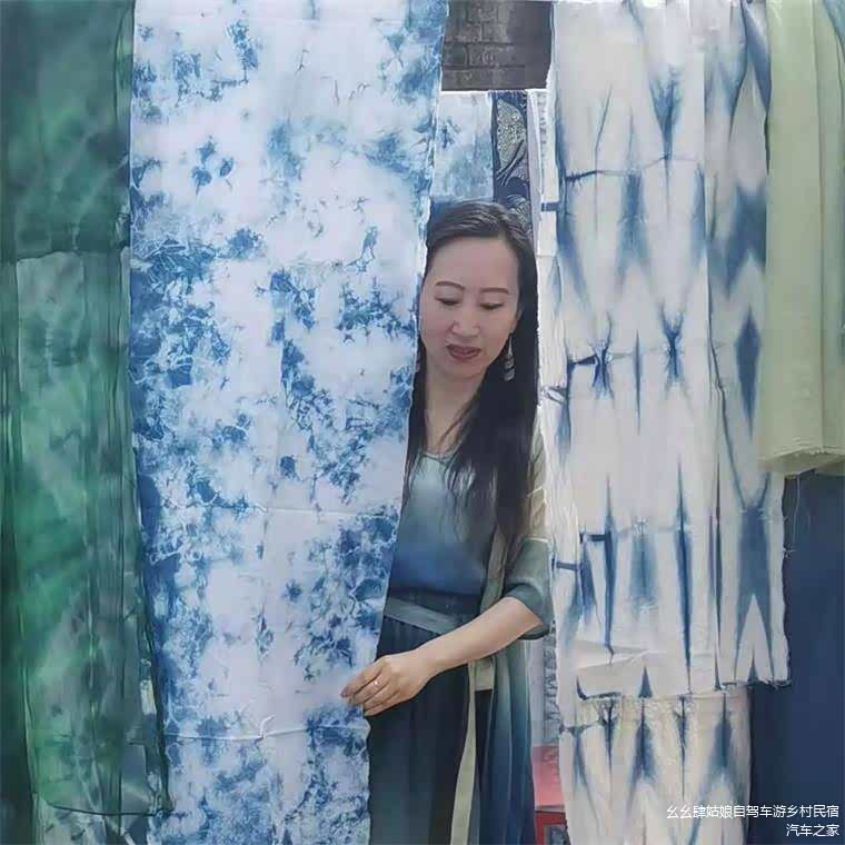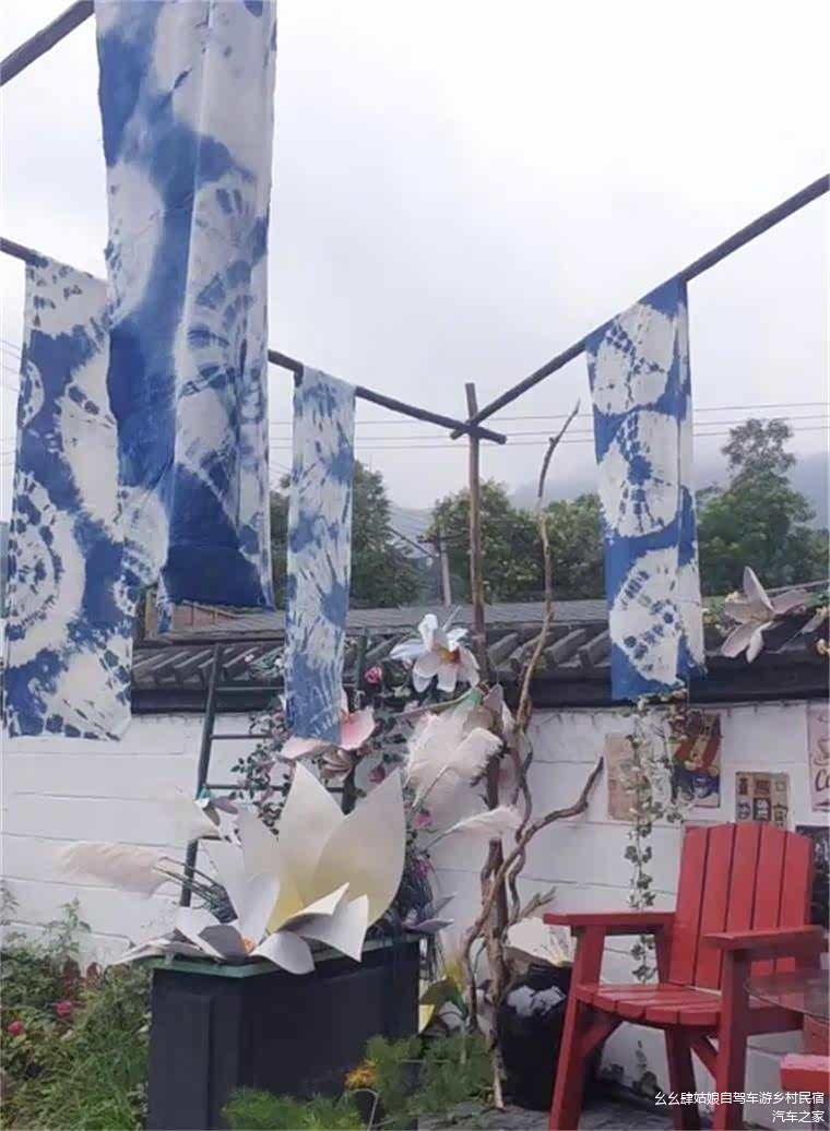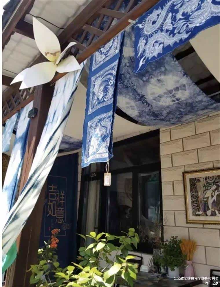 小院配着院主人自已手工蓝染的扎染蜡染作品及蓝染布作装饰的装置艺术,让人们仿佛走入了南方的小院