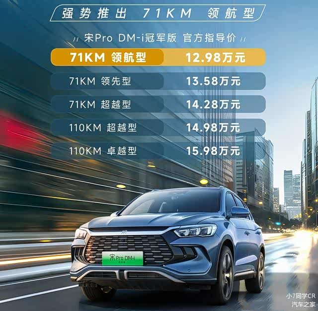 9月26日,比亚迪宋Pro DM-i冠军版新增车型——2023款比亚迪宋Pro DM-i 冠军版 71km 领航型领航型上市,售价12.98万元。作为新增车型(冠军版入门款车型),新车延续了在售车型的造型设计,同时在售价及配置方面进行了调整。