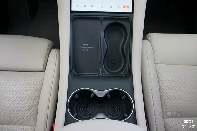 在屏幕后方,是手机无线充电区域,旁边还设计有用来放置眼镜的储物格。两个杯架,在中央扶手箱的前方。