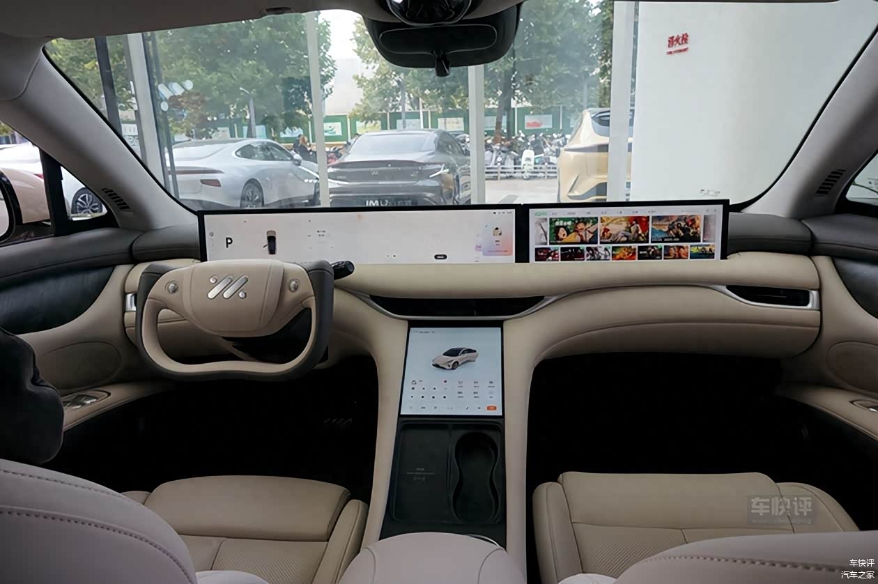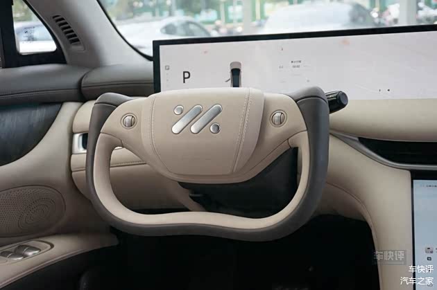 来到车内,智己LS6内饰的设计风格也跟智己LS7比较相近。配备了贯穿整个中控台的中控大屏和半辐式方向盘。空调出风口的设计并没有采用智己LS7上的贯穿式出风口,中控台下方大尺寸的液晶触控屏也没有缺席。这块屏幕主要是用来控制空调、座椅、驾驶模式以及车门的。