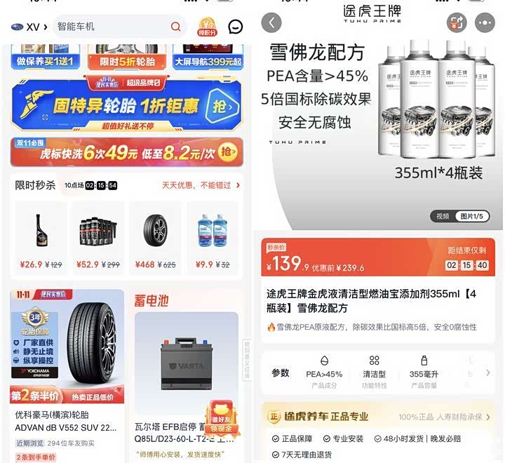 车品方面大家可以留意双十一主会场入口下方的限时称杀,常用的燃油宝、玻璃水、防冻液等车上可能用到的东西都有,限时秒杀活动中的商品价格都十分给力,可以挑有需要的入手。之前XV一直用斯巴鲁原厂的200ml PEA燃油系统清洗剂,价格约80元一瓶,直至近来看到双十一活动139.9元4瓶355ml的途虎王牌金虎液清洁型,其采用浓度高达45%的雪佛龙PEA原液,十分适合直喷发动机车型。5000公里使用一瓶就能有效去除喷油嘴、进气阀、火花塞、活塞等部位的积碳,有效提升动力、降低油耗、优化排放,减少积碳过多导致的大修风险。