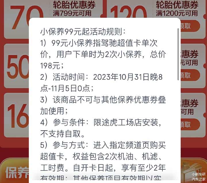 点击主会场入口可领多种面额的轮胎、保养、电瓶优惠券,11月10日来的话预计能领到更给力的优惠面额,要注意这些优惠券也是限量的,只是数量比较多罢了。而我是冲着“88元轮胎”和“99元小保养套餐”而来的,我来的时候全合成小保养99元的活动还在,内心窃喜了一下,价格实在太给力了!