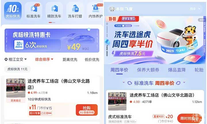 洗车的话一定要知道途虎的周四半价虎式标准洗车,门市价40元只需20元,只要注意仅限周四抢购及周四使用就可以了。虎标快洗原价15元/次双十一专享11元/次,原价90元的虎标快洗*6次特惠卡仅售49元!