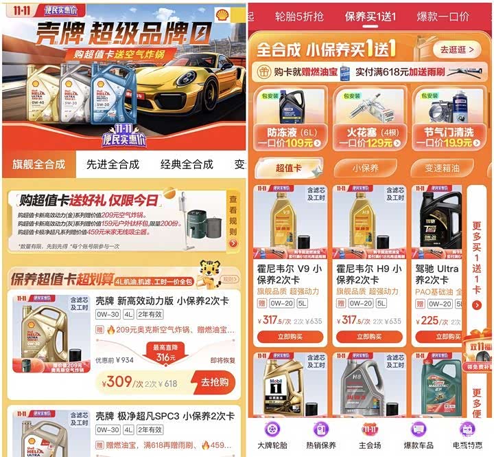 如果座驾比较高档,相信大牌的话,也有知名机油品牌的超级品牌日活动。像11月2日就是壳牌的超级品牌日,像购买原本性价比已极高的新高效动力版金罐系列小保养2次超值卡,就送209元空气炸锅,限时活动,大家可留意实时的赠品。