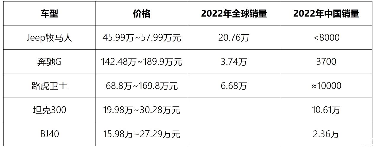 Jeep牧马人是细分领域的全球销冠,不过中国销量不足8000辆,还是价格太贵。中国品牌的硬派越野车,坦克300排第一位,妥妥的牧马人平替,2022年全年销量10.61万辆,非常了不起的成绩。据说坦克500上市首月销量2023辆,Hi4-T版本累计订单突破2万辆,也挺不错。