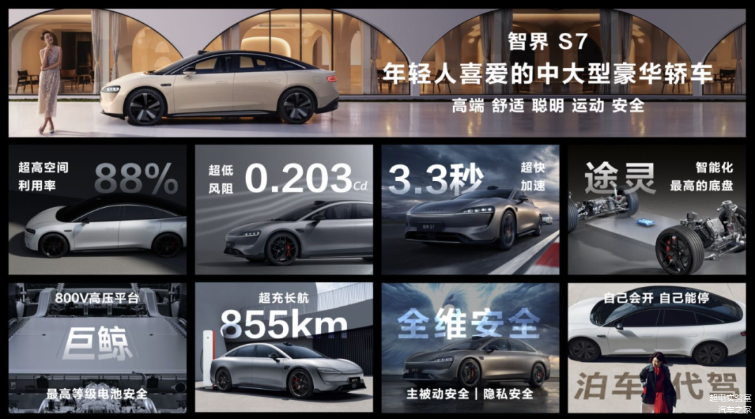 作者|王磊以后海底捞会不会出现 智界S7(图片 | 参数 | 询价)?毕竟科目三它是满分。今天下午,华为系首款纯电轿车——智界S7正式上市,亮相的方式很不一般,直接现场演示无人代客泊车,自己开到舞台上来了。超电实验室余承东也是不遗余力地为智界S7加持各种“遥遥领先”。AEB可以强势“碾压”其他车企,工作时速范围4-130km/h,其中静止车的识别已支持 120km/h 车速,相比今年9月提升了33%。华为“巨鲸”800V高压电池平台,充电5分钟续航215km,CLTC综合续航可以达到855km。