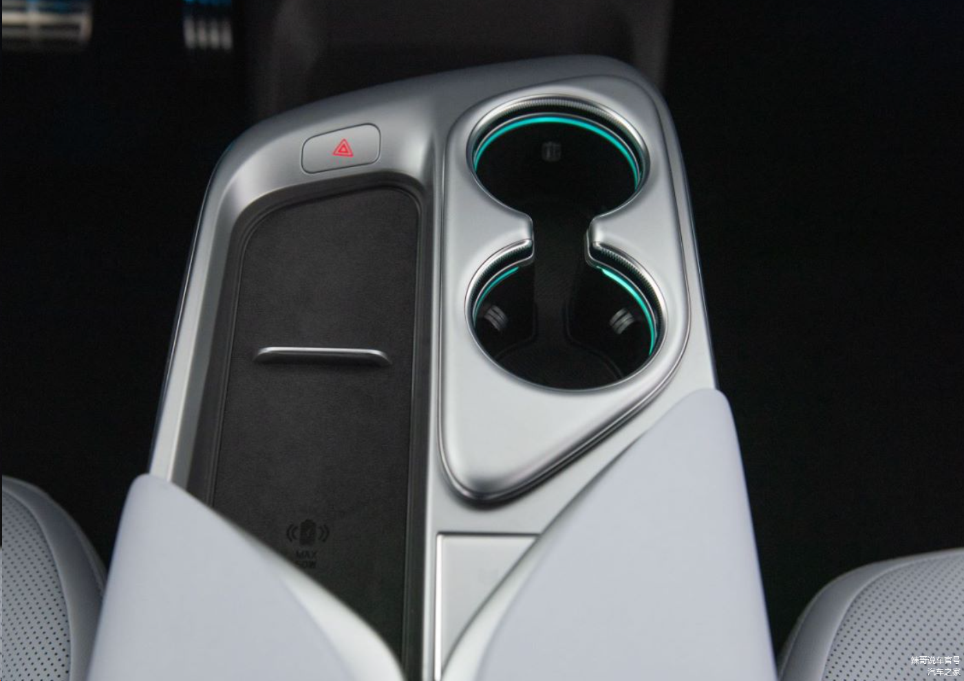 极狐阿尔法T5采用了怀挡设计,所以中央区域的空间被节约出来,安装了前排手机无线充电、两个杯架和警示灯按钮,在杯架的内部还加装了氛围灯进行点缀。