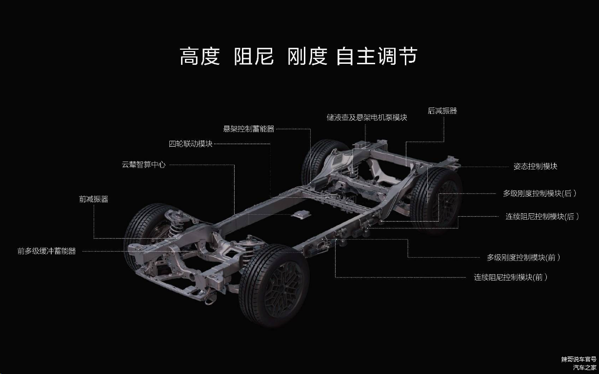 此外云辇P还能对每个车轮的高度进行单独调节,当车辆停放在不平整的路面的时候,就可通过单独调节来实现车身水平平衡,官方将其称之为“露营模式”。当车辆行驶在崎岖的交叉轴道路上,每个车轮得到不同的离地高度,就能在通过性和脱困性上有更好的表现,提升整车的越野极限。