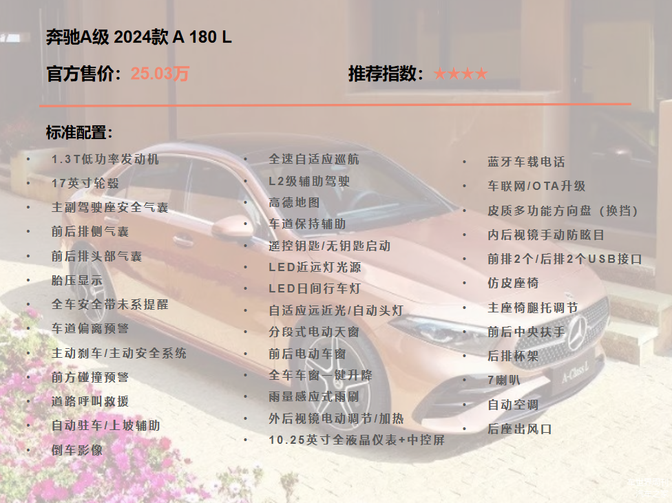 车型点评:入门版A 180L,售价25.03万,虽然是入门级车型,但是整体配置水平还是不错的,尤其在安全辅助驾驶和科技性配置上,基本都是全系标配水准,如果预算有限,且对动力要求并不是特别高的用户还是可以考虑的。