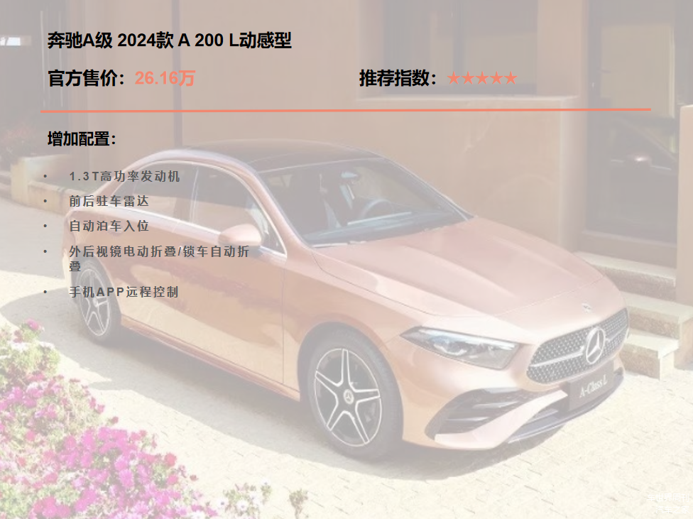 车型点评:中配A 200 L动感型,相比入门车型A 180 L主要差异为1.3T高功率发动机,并且增加前/后驻车雷达、自动泊车、远程启动、外后视镜电动折叠/锁车自动折叠和手机App远程控制等,在动力性能和驾驶便利性上大大提升,多花1万多带来的性价比更高一些。