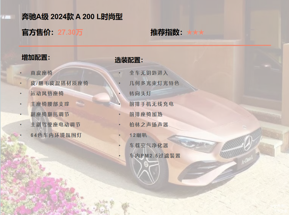 车型点评:顶配A 200 L时尚版,比中配版本又增加了1.14万,配置方面主要增加了真皮方向盘、皮/翻毛皮包裹座椅、运动风格座椅、主/副驾座椅电动调节、主驾座椅腰部调节和64色车内氛围灯等,并且有着更加丰富的选装资格,综合体验更佳,但是真正落地后也得30+W了,这个价格其实能考虑的车型还是比较多的。