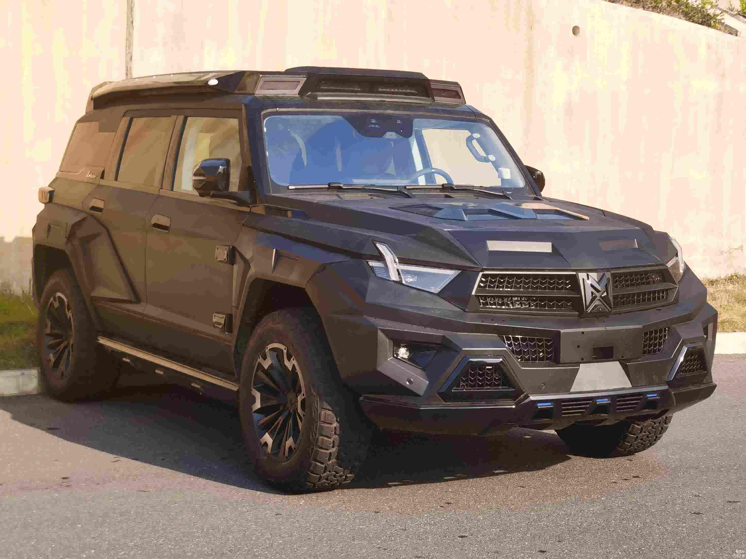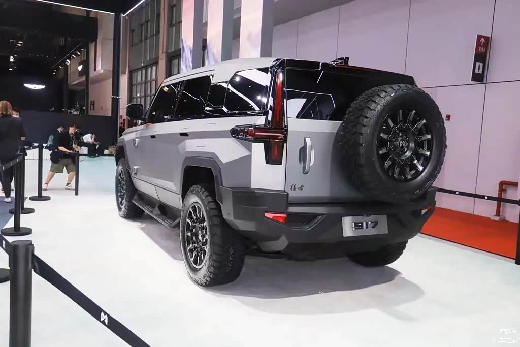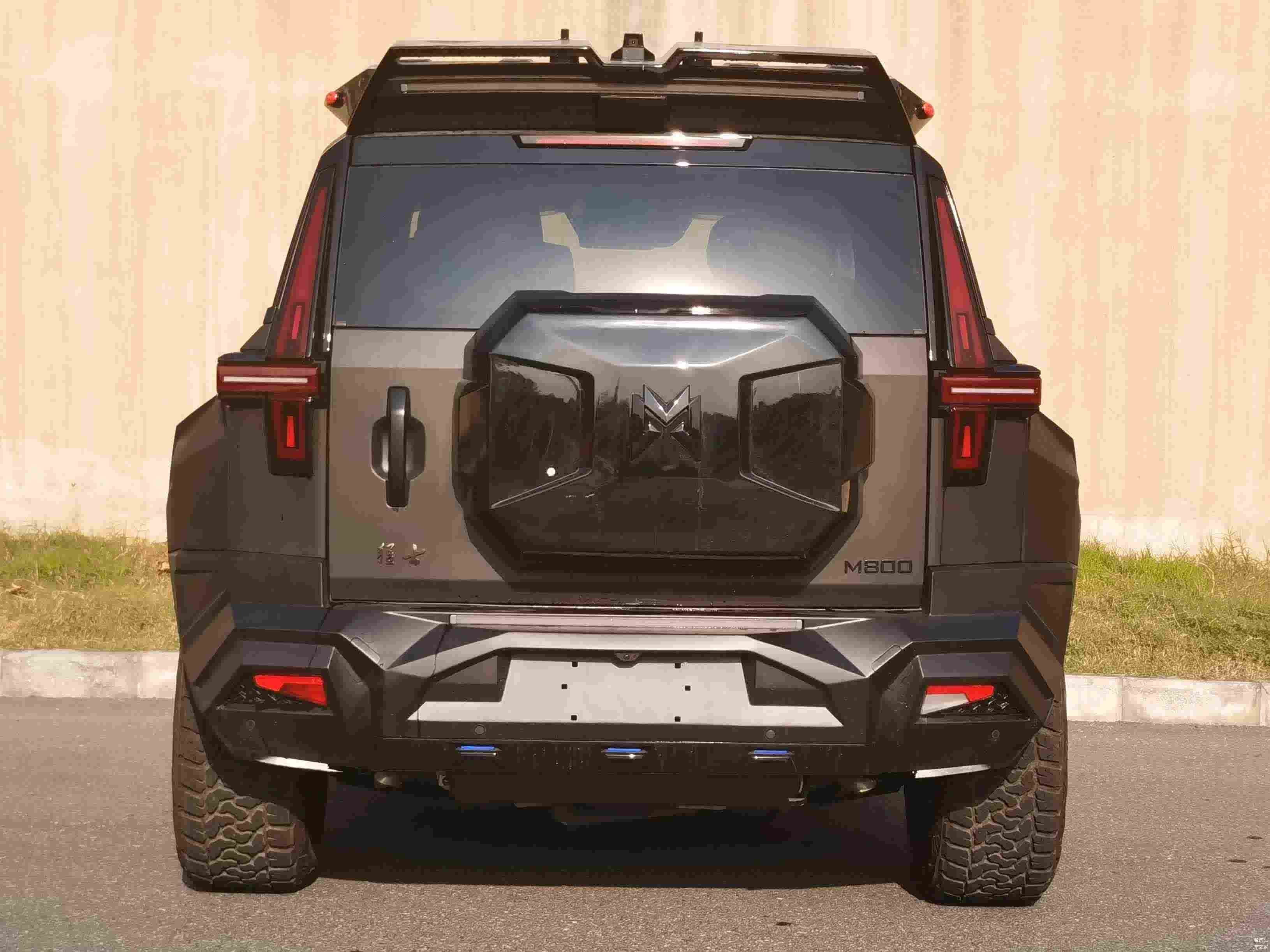 车身侧面造型比较方正,轮眉向外凸起明显,车顶还拥有行李架,配合AT轮胎和侧踏板,看起来野性十足。尾部和猛士917类似,剑形尾灯点亮以后拥有较高的辨识度,并配有外挂式储物盒,整体视觉效果看起来充满机甲风格。