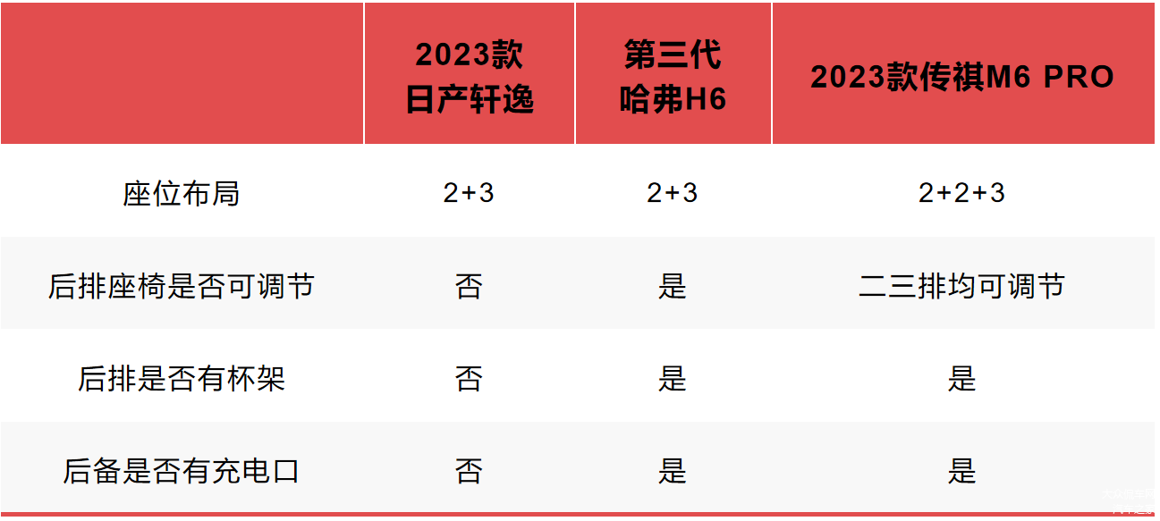 小结:从乘坐舒适体验来看,三台车都能保证为前排乘客提供良好的舒适体验,但从后排体验上来说,传祺M6 PRO要明显比轩逸、哈弗H6更舒服,有着独立的第二排座椅,且二三排座椅均可自主调节,对于乘客来说体验感更好,真正做到让每个位置的家人都舒舒服服的出行。
