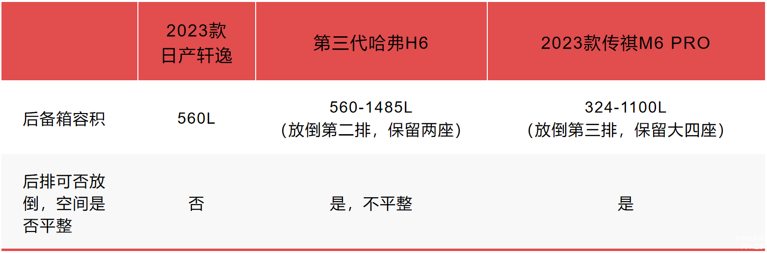 小结:从车内空间角度综合对比来看,传祺M6 PRO无论是还在车身尺寸、车内乘坐空间、后备箱空间,还是可乘坐人数上,都相较于轩逸和哈弗H6更有优势,不管是三口之家还是多口之家,都能轻松满足用车需求。