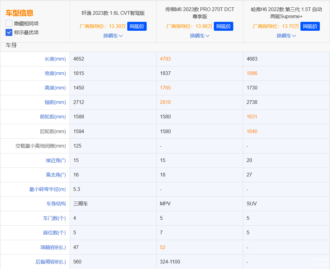 接下来,将以日产轩逸、长城哈弗H6和传祺M6 PRO这三台10-15万级的轿车、SUV、MPV的销冠车型为例,看看究竟谁的家用表现更优?