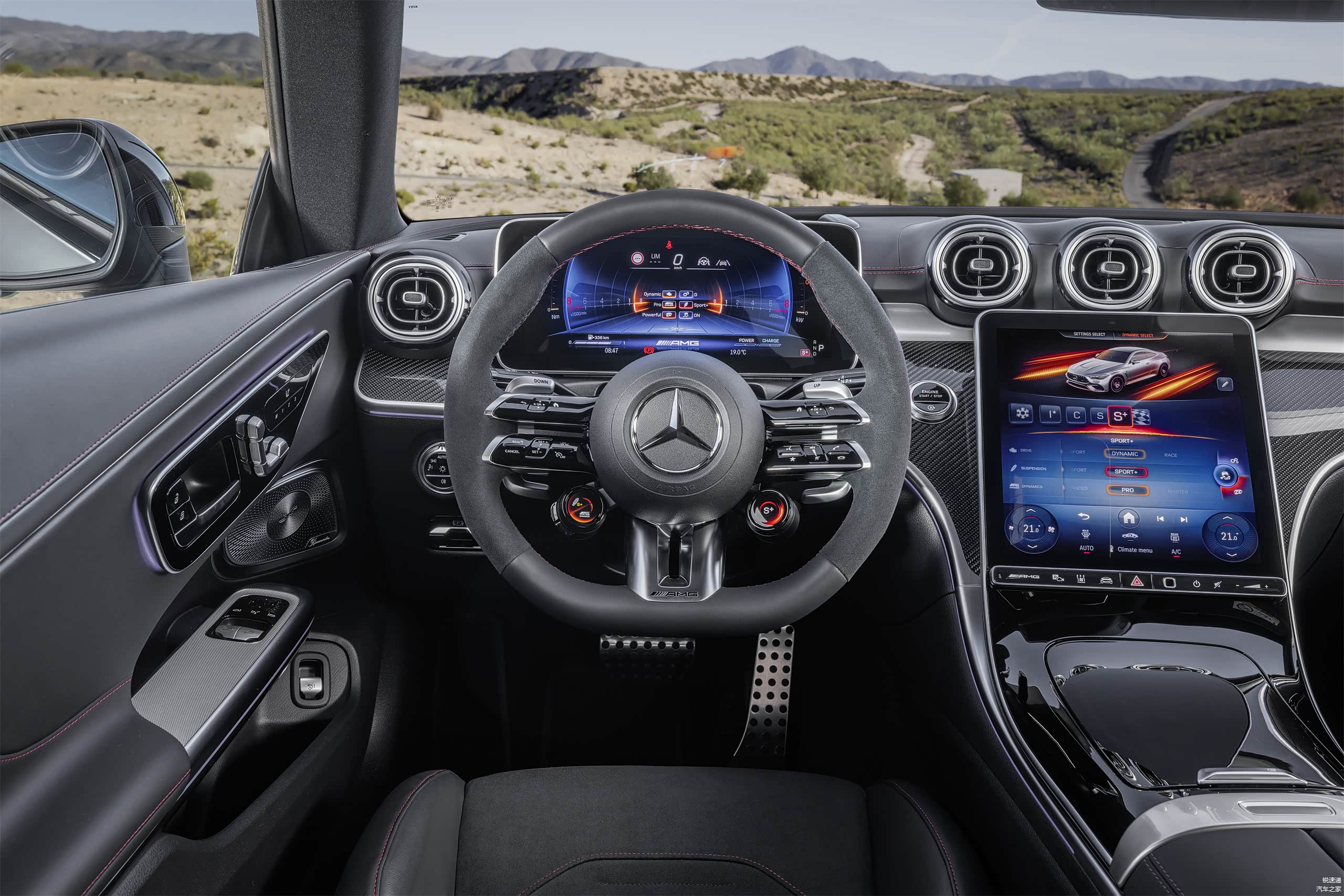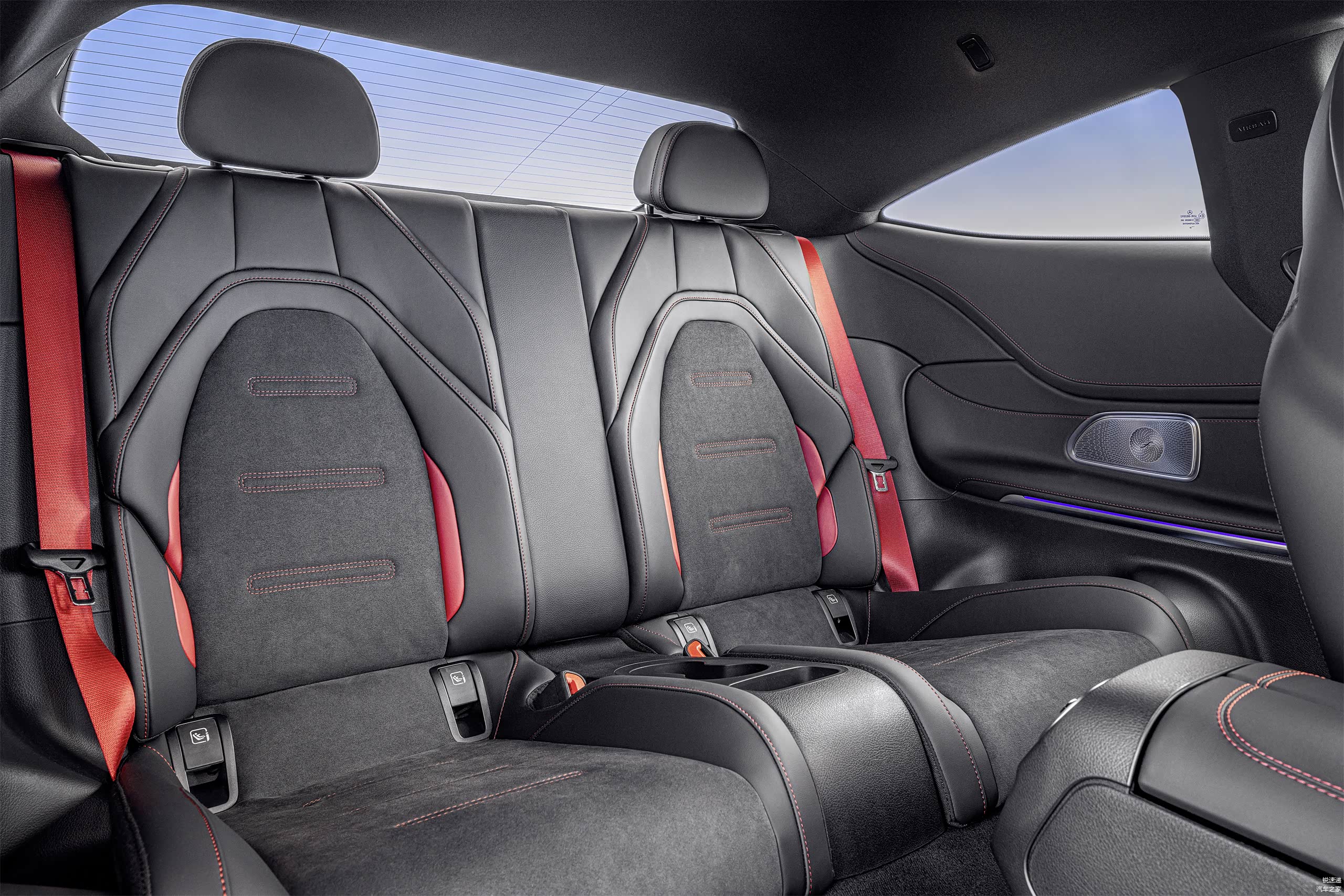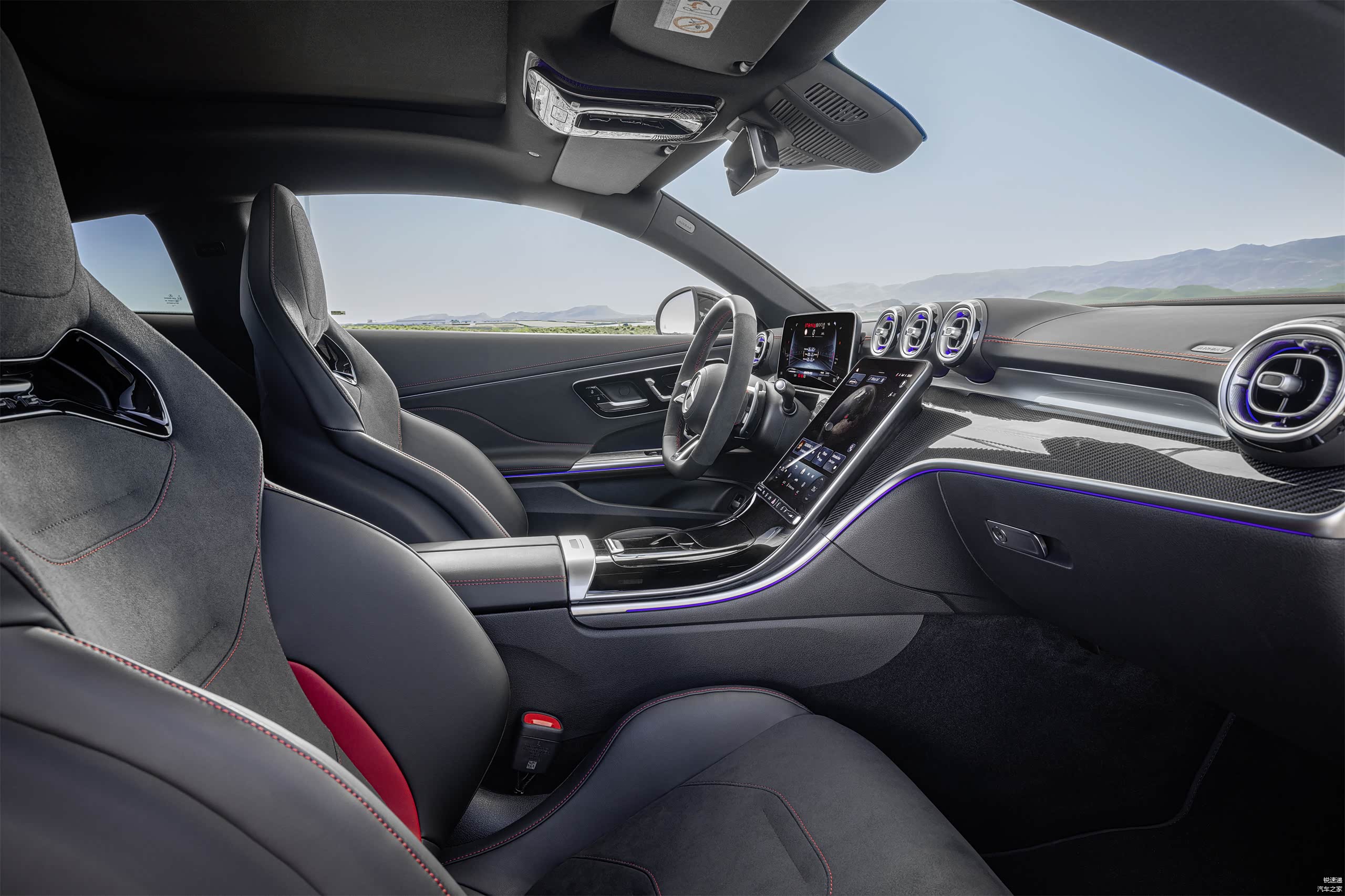 内饰方面:CLE 53延续了12.3英寸液晶仪表+11.9英寸纵向中控屏的设计,配备第三代MBUX智能人机交互系统,座椅布局采用2+2的4座设计,并且前排采用了一体式座椅,同时作为AMG车型具有“超级运动”仪表模式,将转速表放在中心位置,具有档位指示器、圈速计时器和重力计等运动信息,前排座椅头枕上有 AMG 印花。