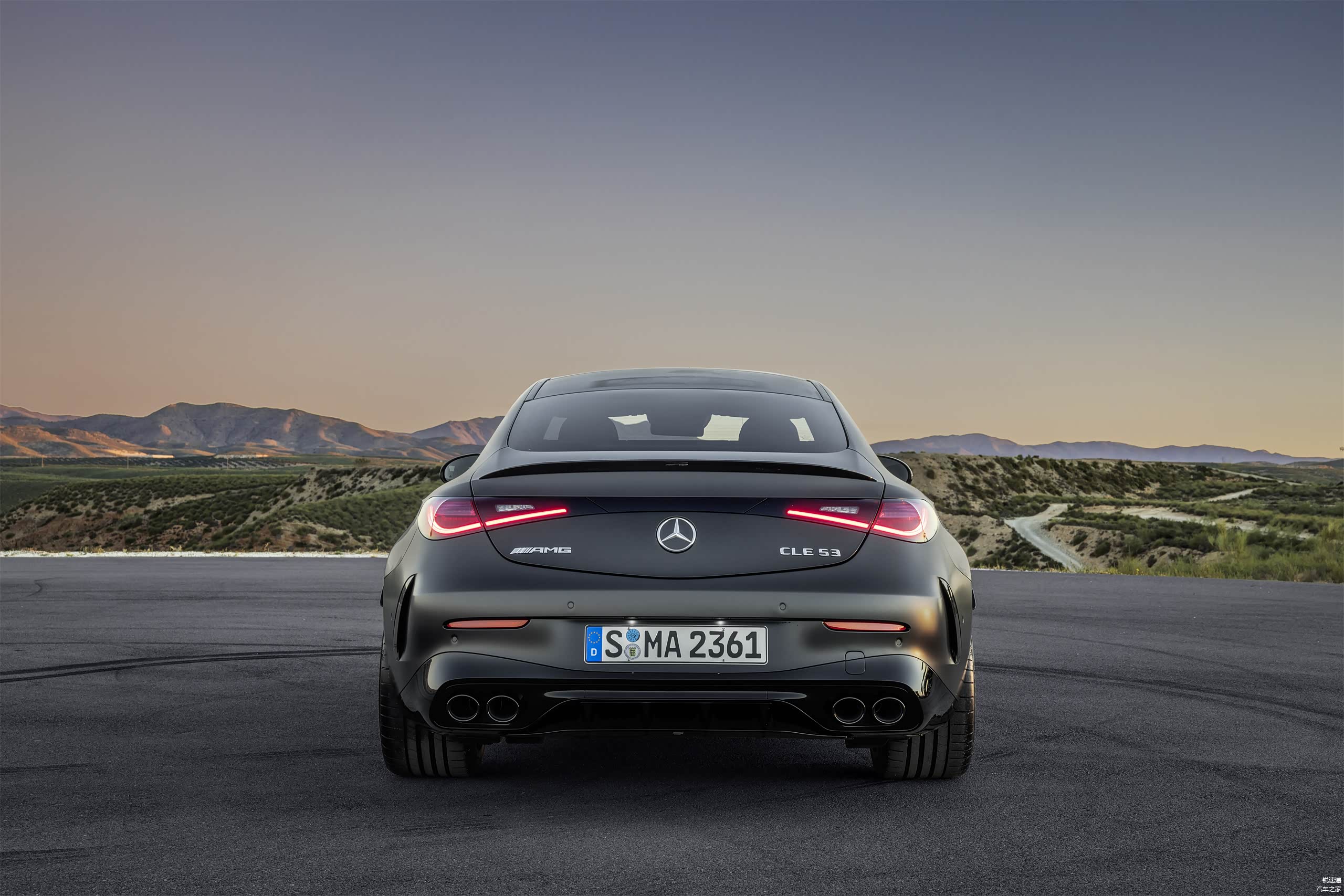CLE车型是奔驰在缩减燃油车序列的背景下推出用于替代C Coupe、E Coupe的后续车型,本次亮相的是CLE的高性能强化版本CLE 53,延续CLE双门轿跑车的典型视觉识别特征,如修长的引擎盖,倾斜Coupe造型车尾,同时作为AMG高性能车技外观细节更加张扬,包括标志性的垂直中网,更加运动化的包围、导流、原型四出排气、扩散器以及轻量化轮毂,前翼子板上增加了“Turbo 4Matic+”徽章,且引擎盖前方没有传统的三叉徽,而是采用AMG专属徽章。