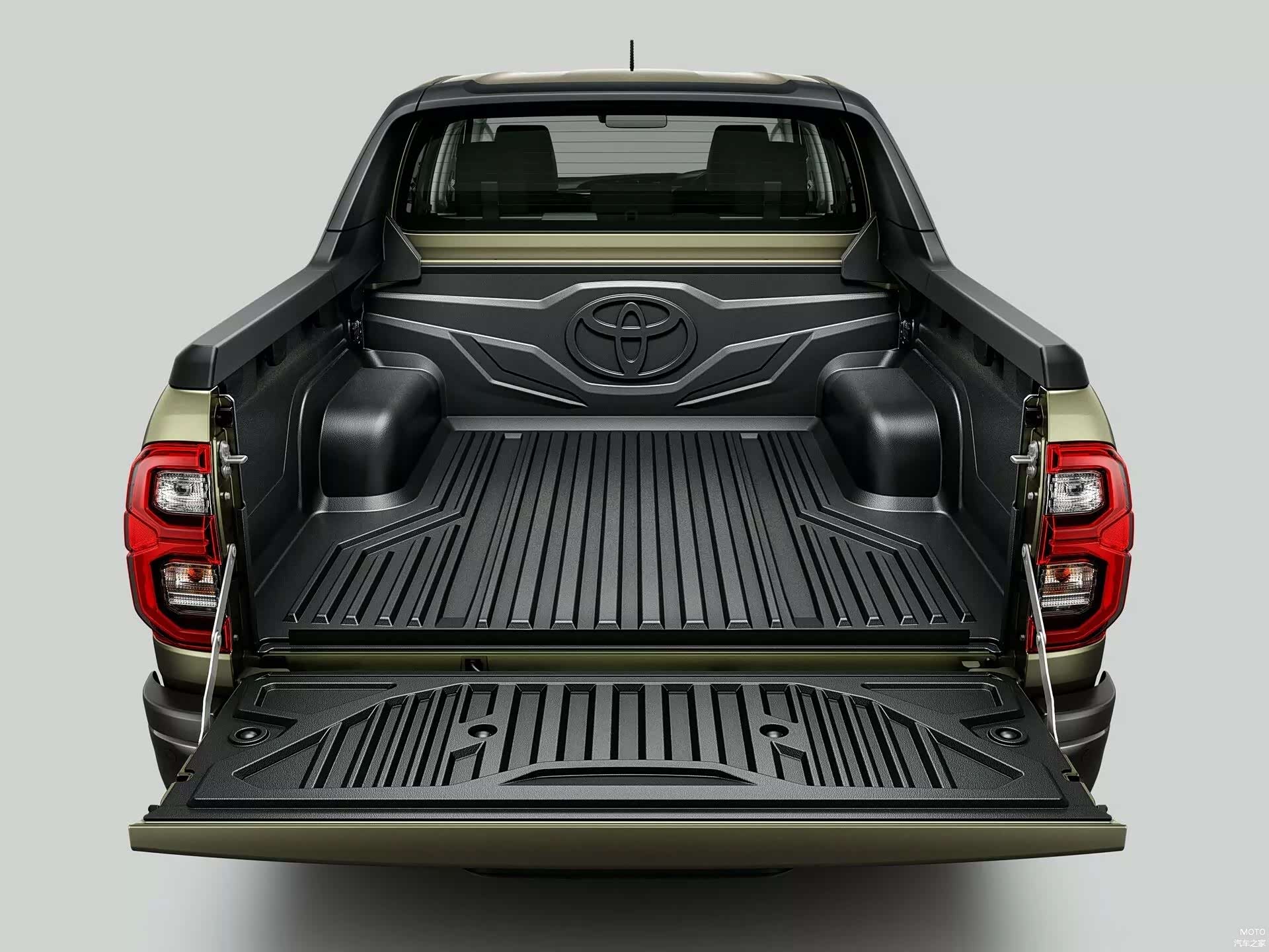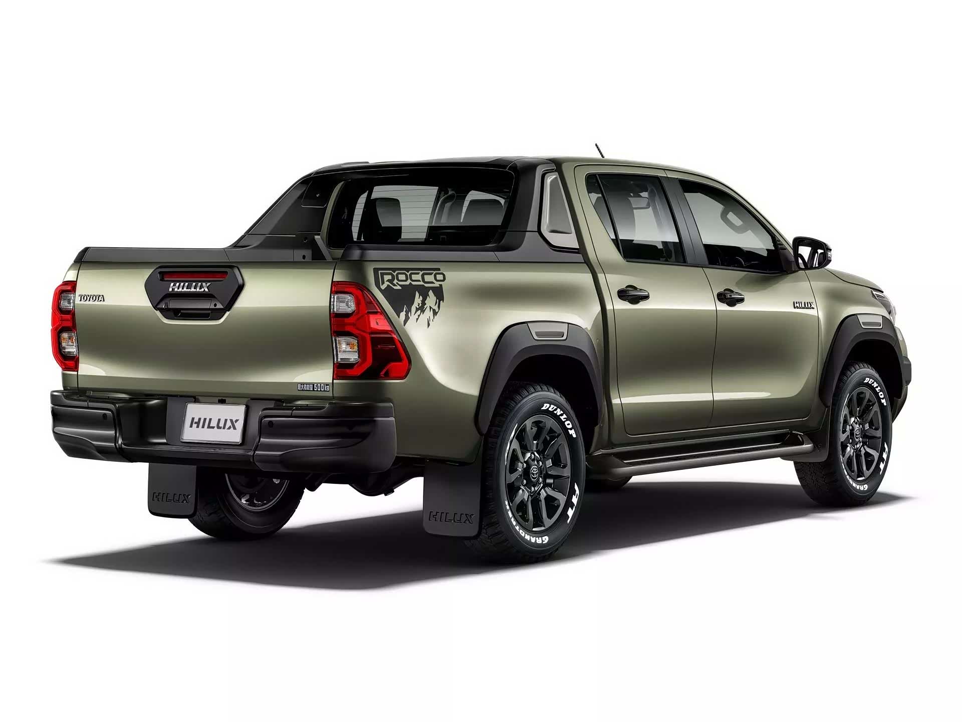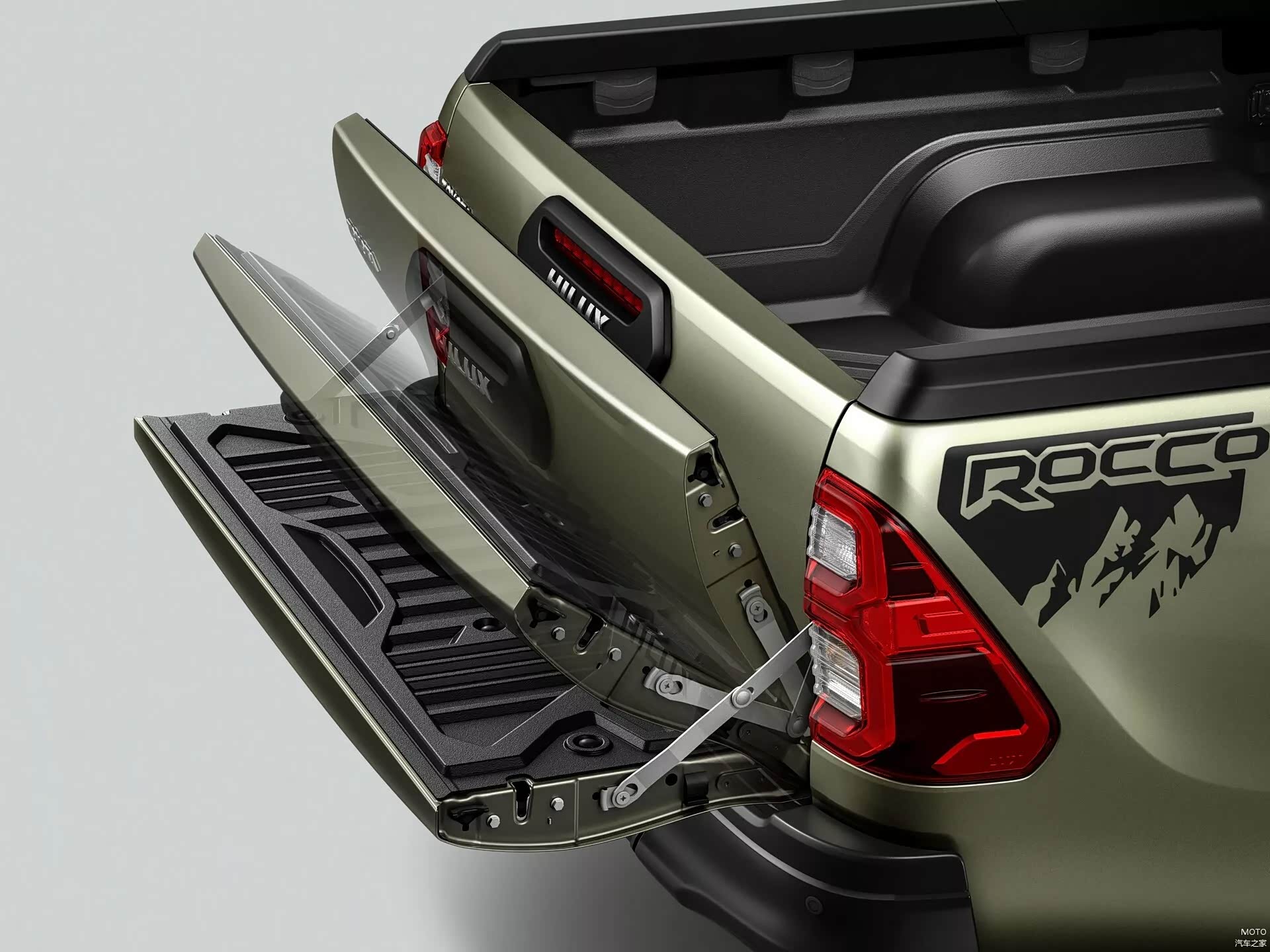全新特仕车丰田 海拉克斯Revo Rocco拥有专属套件,首先在外观上,针对前后保险杠小幅度修饰,看起来更加坚固,独特的水箱护罩,两侧则有配备LED头灯的金属饰条。 车侧独特轮拱黑色塑料材质,上下车有金属登车踏板; 车底安装防撞护板,越野时能避免碰撞损伤。 位于车尾处有Rocco特殊彩绘,货斗特别材质包覆减少刮伤,还有照明轻松拿取货物。 货斗尾门特殊机构,有缓降功能,开启或关闭较为省力。
