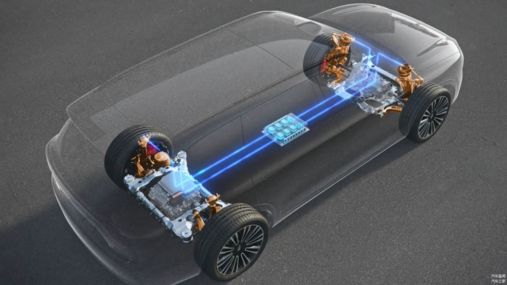 纯电版前驱电机最大功率160kW,最大扭矩277N·m,后驱电机最大功率230kW,后驱电机最大扭矩396N·m。
