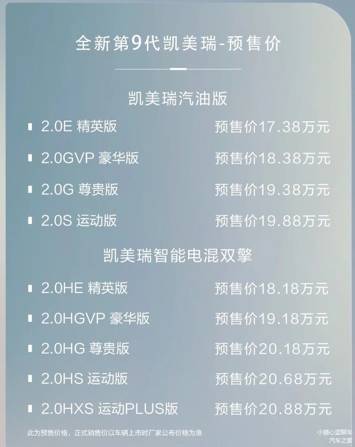 虽然在过去一年销量表现不俗,但凯美瑞也不敢停下升级的脚步,在1月1日,全新凯美瑞正式开启预售,预售价格区间为17.38~20.88万元,共提供7款车型,有2.0L自然吸气和2.0L混动两种动力可选。从预售价格来看,全新凯美瑞的价格门槛相比老款车型的17.98万元略有下探;同时,全新凯美瑞混动版搭载2.0L混动系统,其预售价格也低至18.18万元,远远低于老款凯美瑞2.5L混动版的20.98万元。考虑到目前国内中级车市场的情况和老款车型的终端优惠幅度,全新凯美瑞选择官方降价也在情理之中。
