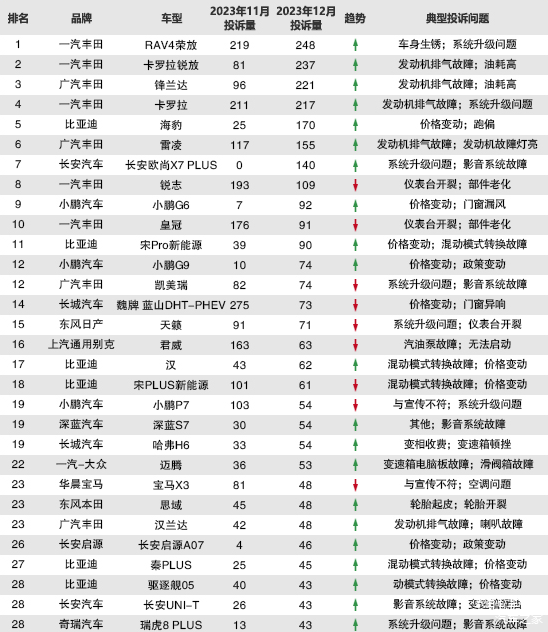 价格门槛下探,这是全新凯美瑞未来抢占市场份额的利好消息,但它也存在一些不确定因素,那就是2.0L混动系统的颗粒捕捉器问题。随着排放标准进一步升级,丰田的很多车型也加上了颗粒捕捉器,从车主反馈情况来看,搭载2.0L混动系统的卡罗拉锐放、锋兰达都出现了颗粒捕捉器问题,因为上述问题,也导致上述两款车型在车质网发布的2023年12月车型投诉榜中,排名第二、第三位。需要注意的是,目前出现颗粒捕捉器问题的丰田混动车型不仅是卡罗拉锐放、锋兰达,还包括搭载1.8L混动系统的卡罗拉。对于丰田而言,混动车型出现颗粒捕捉器问题,显然不是好消息。