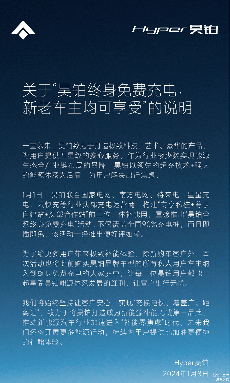 愈发竞争激烈的新能源市场不仅会降低售价,更会“新招频出”以提升自家的新能源车型销量。昊铂凭借充换电快+覆盖广+距离近+超级宠粉服务的优势,打造成新能源补能无忧第一品牌,此举如果能有效提升品牌销量,想必未来“终身充电”也会被一些品牌所争先效仿,或许用不了多久,纯电车主就能实现免费出行了。
