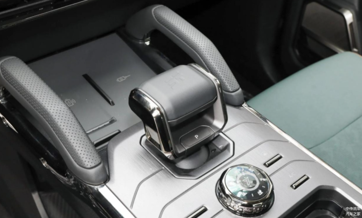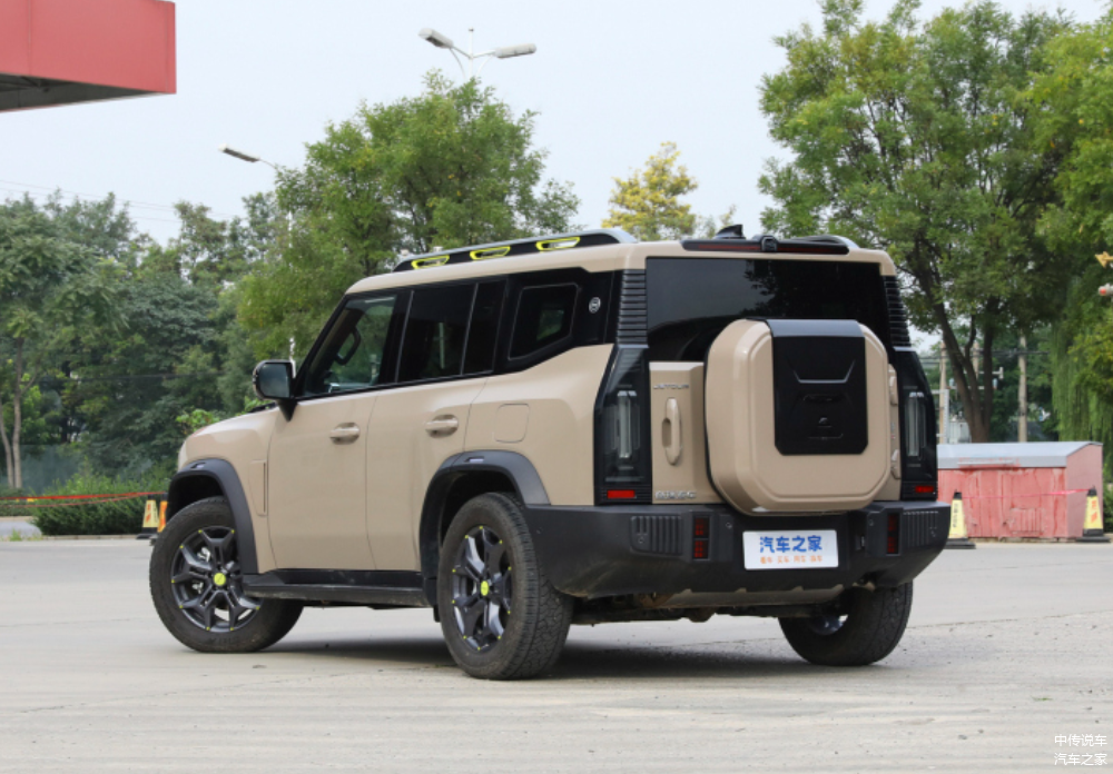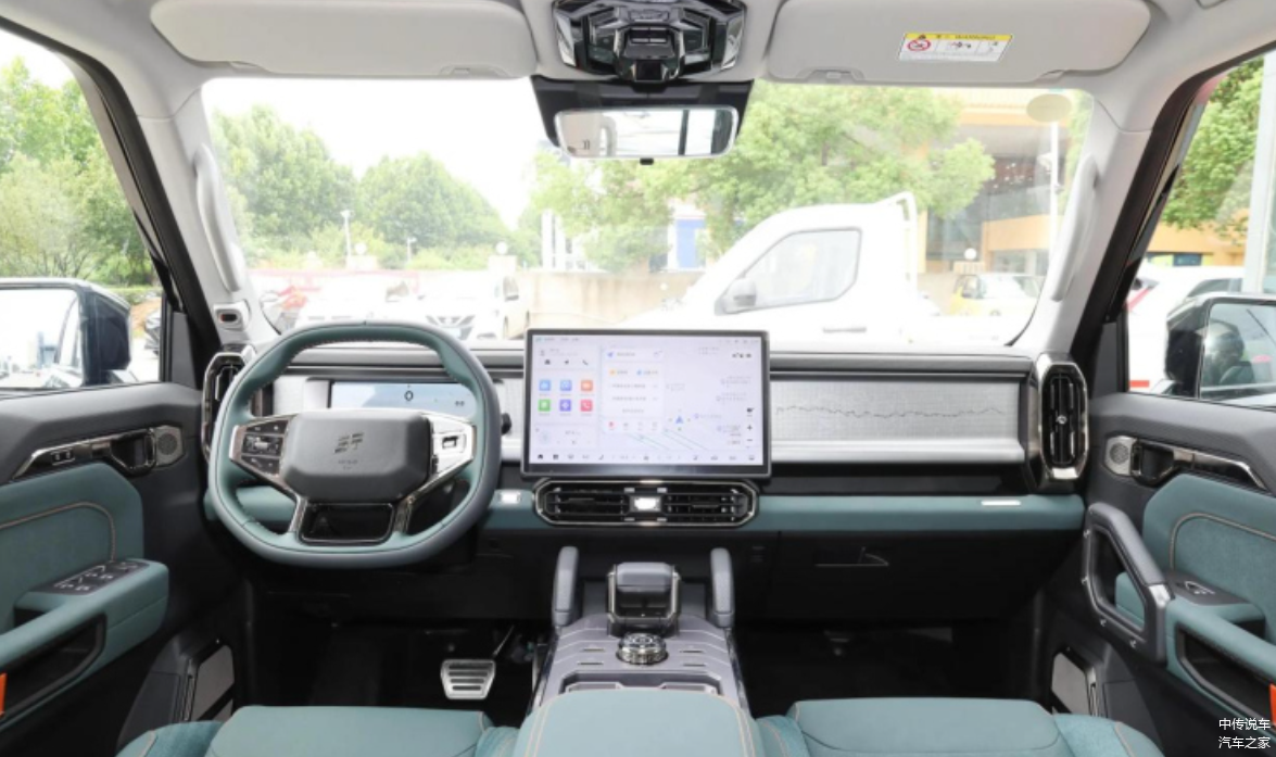 车内设计同样出彩,采用平直的线条打造出见棱见角的感觉。T型中控对称式布局与椭圆形方向盘相呼应,提升了驾驶的便捷性。12.25英寸液晶仪表和15.6英寸悬浮式中控屏则提供了丰富的科技配置。副驾位置增加储物槽,A柱位置和马鞍区均配备扶手,提供更加舒适的驾驶体验。车内用料方面,台面采用搪塑工艺,门板内侧则采用翻毛皮材质,点缀金属饰条和铆钉装饰,进一步增强了硬派越野的氛围。