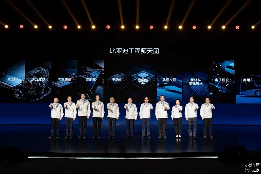 发布会上,比亚迪十大工程师天团首次亮相,展现比亚迪脚踏实地的工程师文化。如今,比亚迪拥有9万余名工程师,是全球研发人员最多的汽车企业。