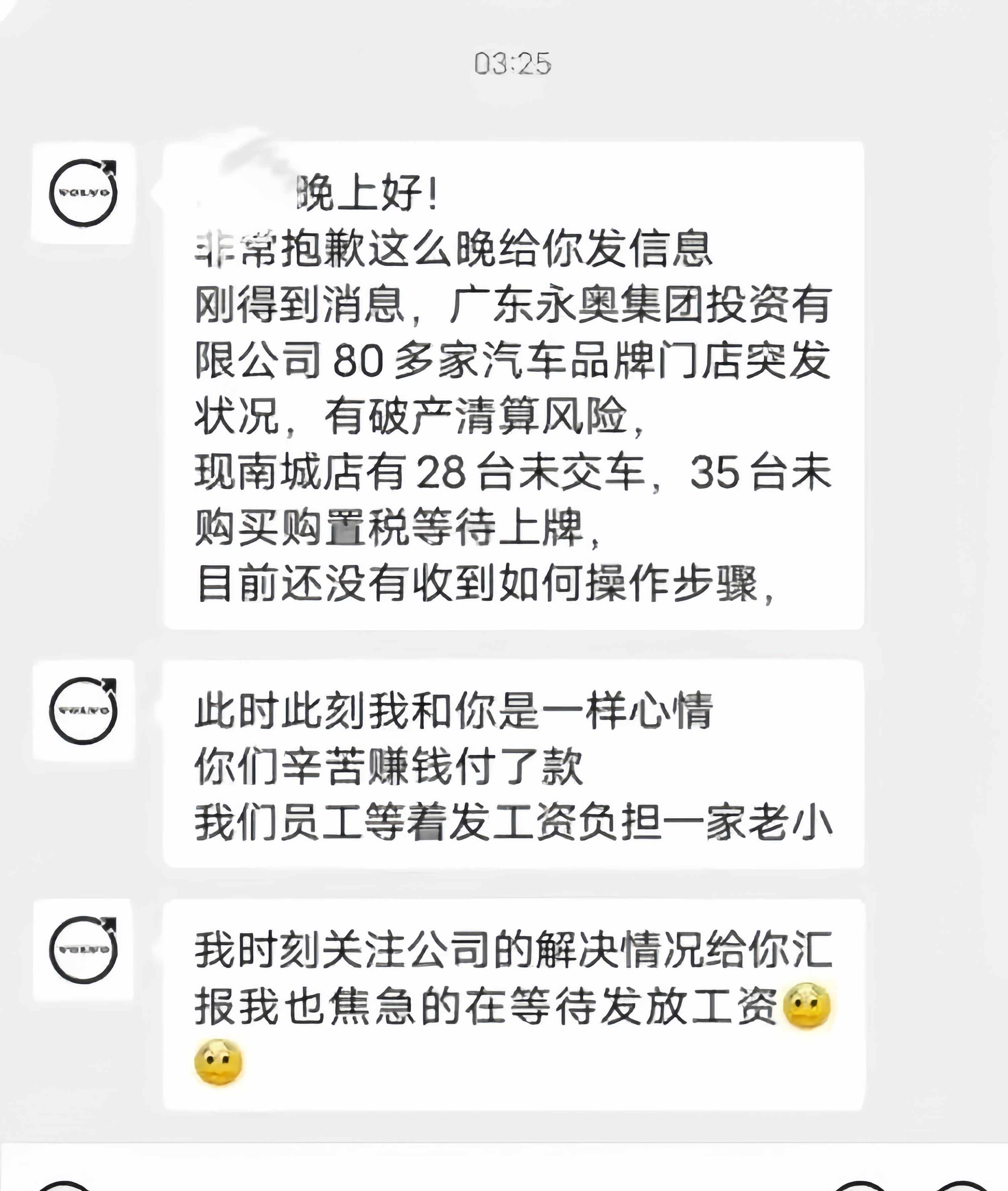 据网络信息显示,多家位于东莞的广东永奥门店已暂停营业。另据报道,有工作人员称:“广东永奥集团投资有限公司80多家汽车品牌门店突发状况,有破产清算风险,现南城店有28台未交车,35台未购买购置税等待上牌。”