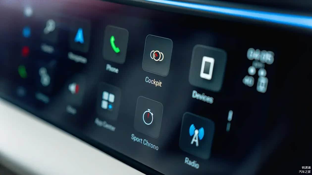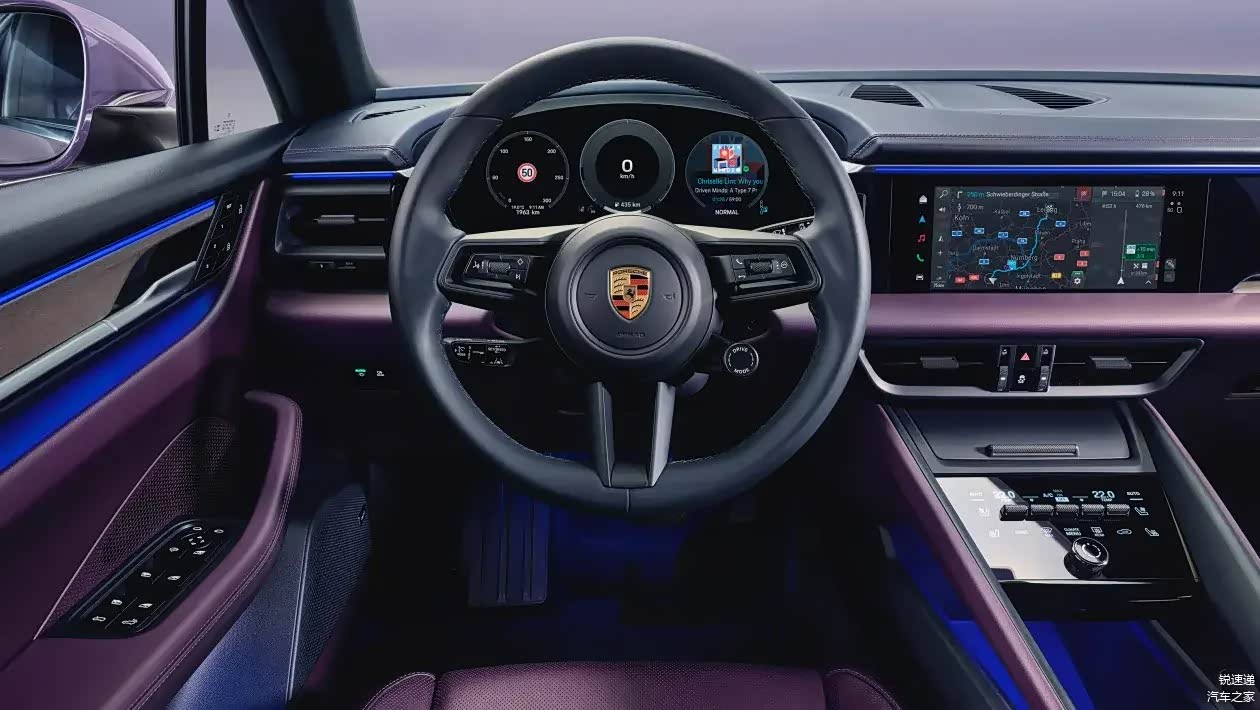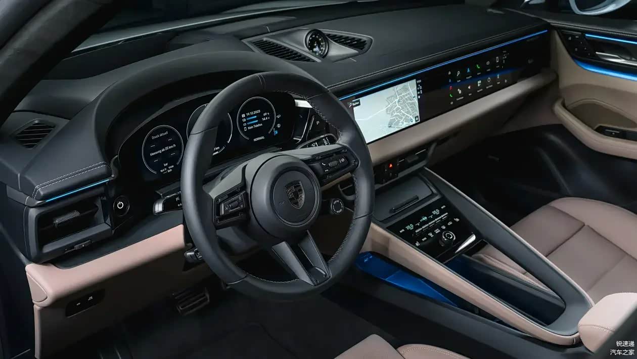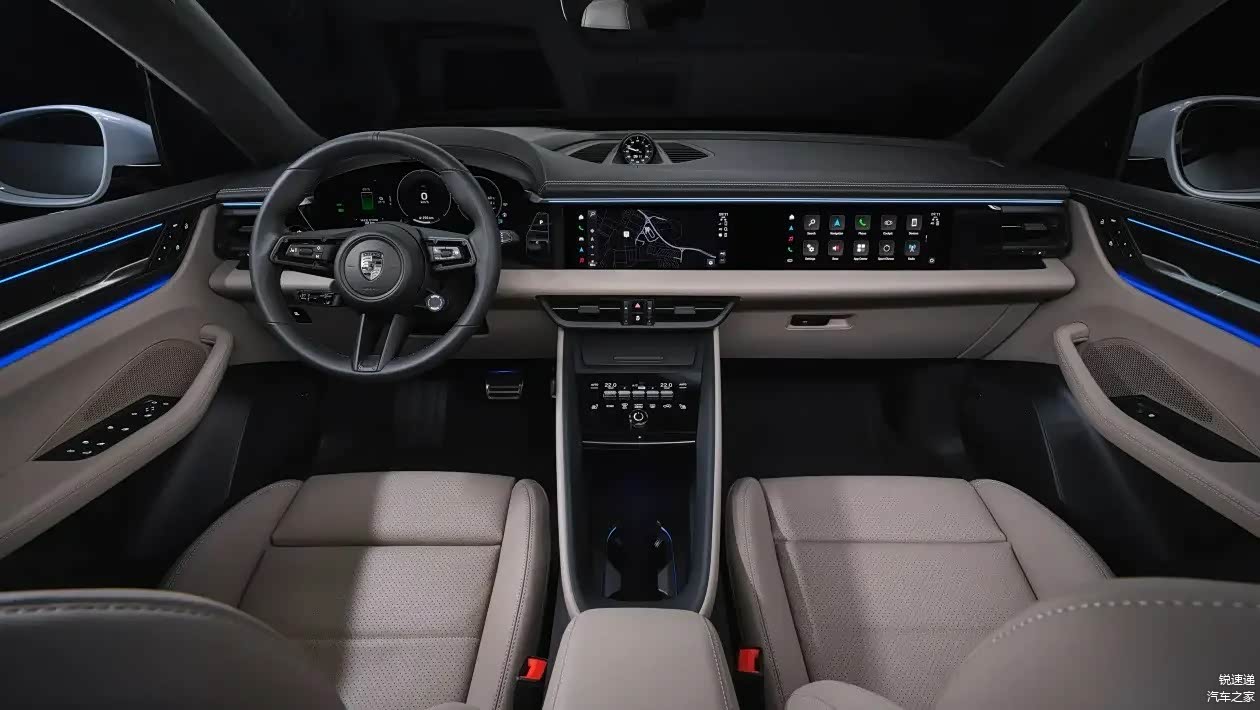 内饰方面:全新Macan与现款卡宴较为类似,采用12.9 英寸曲面液晶仪表和 10.9 英寸中控触摸屏,此外可以选装第三块副驾屏,空调和音量控制分别位于悬浮式中控台上,下方设有无线手机充电装置。中控屏内的交互系统采用原生安卓底层,相比保时捷现有系统可以支持更多应用且更流畅。