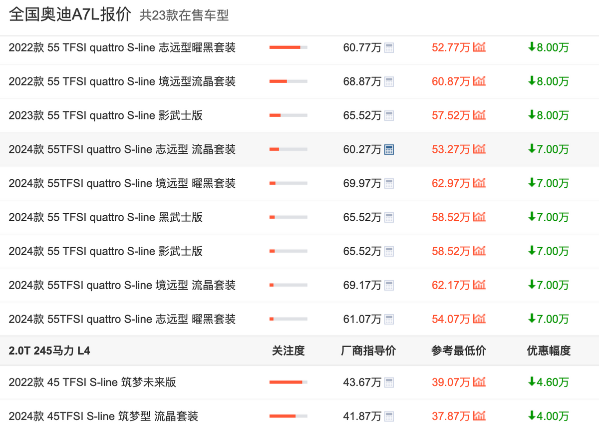 不得不承认,影响奥迪A7L最直接的因素就是价格了。从笔者在车主之家查询的信息来看,目前全国共有23款奥迪A7L在售车型,不过其优惠幅度已经在4-8万元之间,这也使得奥迪A7L的入门款车型售价跌破40万元,参考最低价在37万元左右,一款豪华C级车能有这样的售价,性价比无疑是大大提升的。