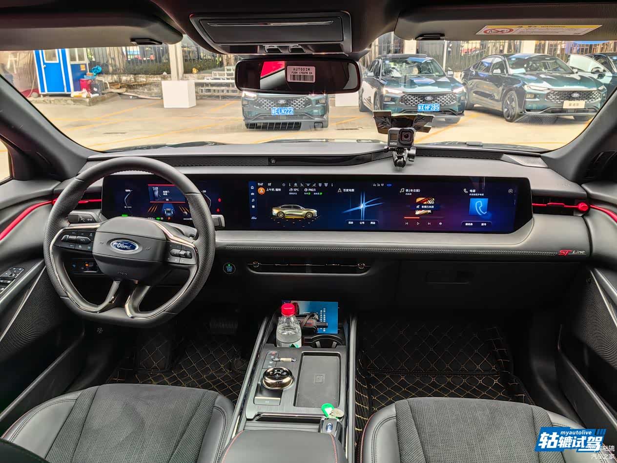 在内饰方面,蒙迪欧E-混动版的ST-Line版本加入了红色装饰以及“ST-Line”标识,进一步提升了座舱的运动感。另外,新车还配有大联屏,屏幕不仅科技感十足,还包含各种信息,满足你的驾驶和娱乐需求。大联屏的信息虽多,但排列井然有序,用不了多久就能熟练使用。