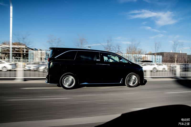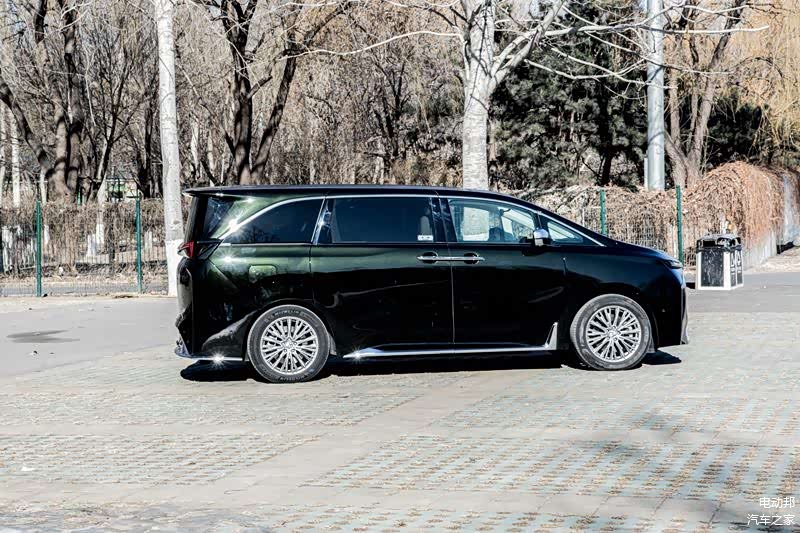 它的车身侧面也同样兼具了高端气质和实用性。这里并没有复杂的线条和镀铬装饰,而是把“好钢”都用到了“刀刃”上,一条贯穿前后的腰线让车身更显修长;车窗上沿的镀铬饰条和底部的镀铬底边增加精致细节;隐藏式B/C柱搭配二三排隐私玻璃,进一步提升了高级和尊贵气质。