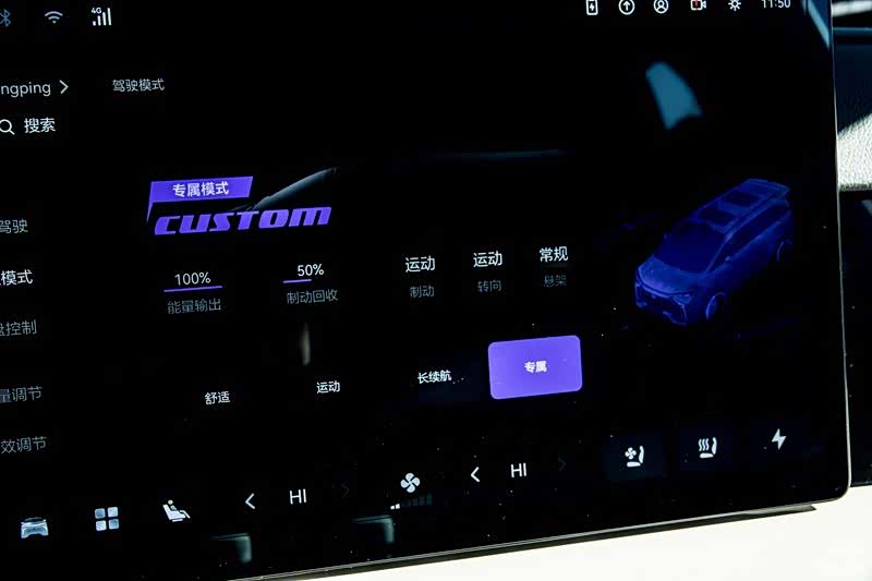 在底盘够稳的基础上,合创V09的动力输出也足够细腻。它为我们提供了四种驾驶模式:舒适、运动、长续航以及专属,其中「专属」就是自定义,可以更详细地设置能量输出、制动回收、悬架、转向、制动的力度和风格。