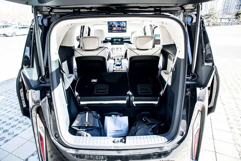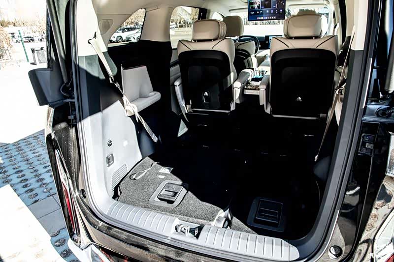 顺着电尾门再聊聊合创V09的后备箱空间,这里一共有四种模式,即第三排正常坐人的时候,第三排座椅靠背向前放倒的时候,第三排座椅完全收纳到后备箱底部的时候,以及二三排座椅都放倒的时候。其中第二种情况最大可获得610L容积,最多放置7个20寸行李箱;第三种情况最多可获得2430L储物空间;最极致的第四种情况下,合创V09的“后备箱”可扩充到3010L,非常能装。
